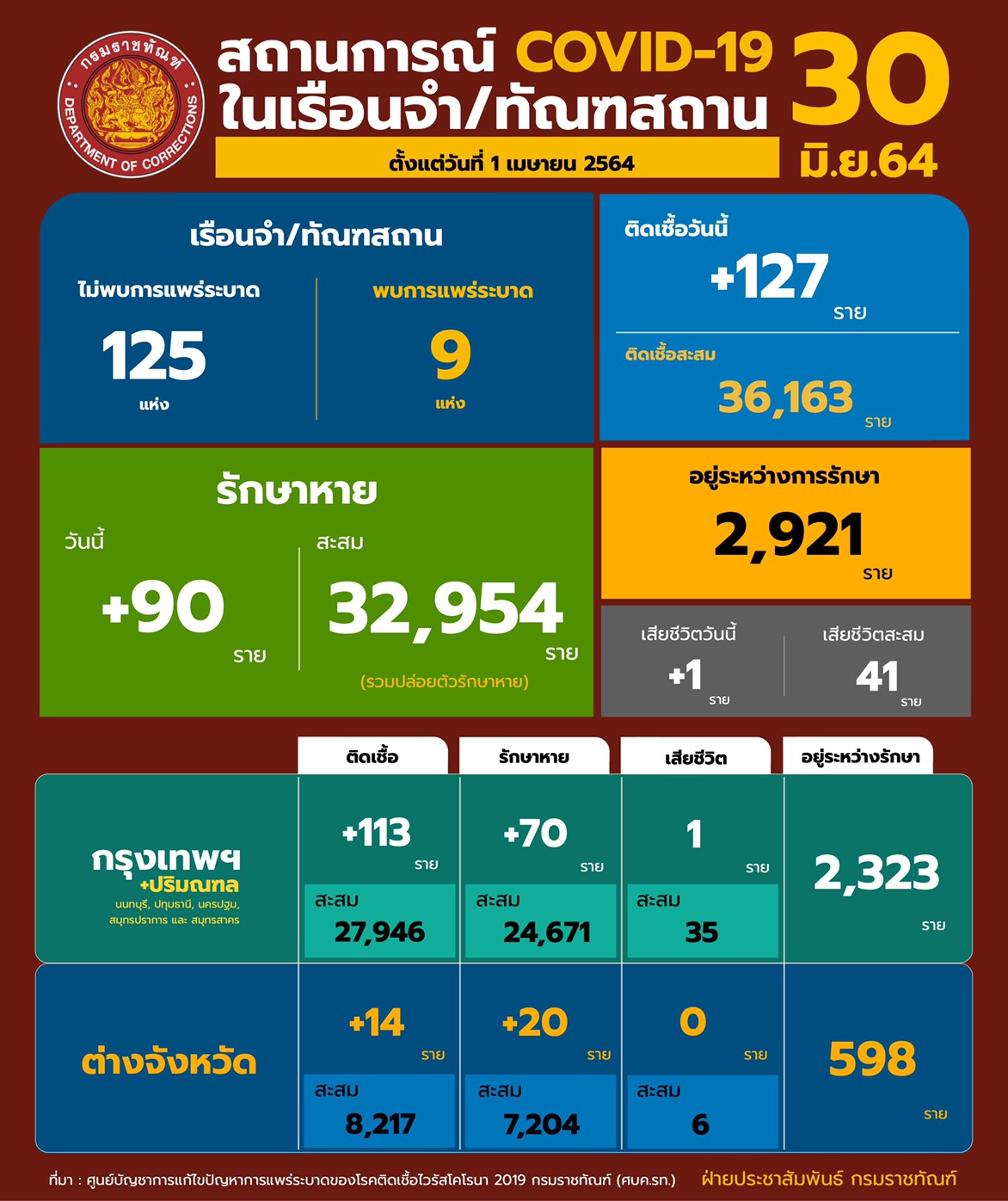 กรมราชทัณฑ์ 30 มิ.ย –กรมราชทัณฑ์ รายงานสถานการณ์โควิดในเรือนจำ พบผู้ต้องขังติดเชื้อรายใหม่ 127 ราย เสียชีวิต 1 ราย ยังมีผู้ต้องขังติดเชื้ออยู่ในการดูแลของกรมฯ 2,921 ราย พร้อมปรับลดเรือนจำสีแดงลง 3 แห่ง หลังสถานการระบาดเรือนจำดีขึ้น