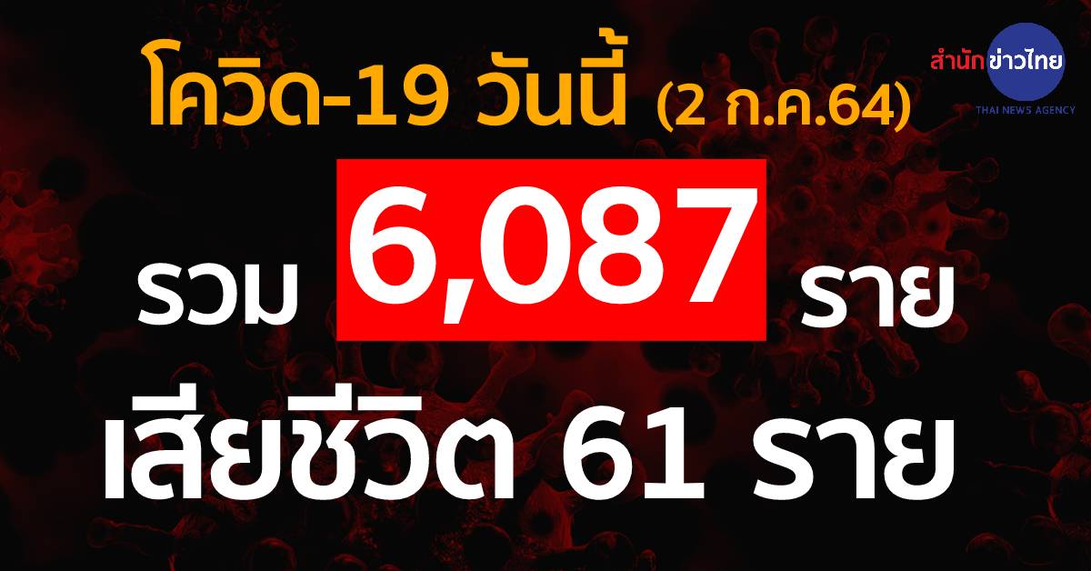 ศบค.รายงานสถานการณ์แพร่ระบาดของโควิด-19 ประจำวัน พบผู้ติดเชื้อรายใหม่ รวม 6,087 คนจำแนกเป็นติดเชื้อใหม่ 5,880 คน ติดเชื้อภายในเรือนจำ/ที่ต้องขัง 207 คน ส่วนยอดเสียชีวิตพบเพิ่มอีก 61 คน นับว่าสูงที่สุดตั้งแต่มีการแพร่ระบาดเป็นต้นมา ผู้ป่วยสะสมตั้งแต่เดือนเมษายน 242,058 คน