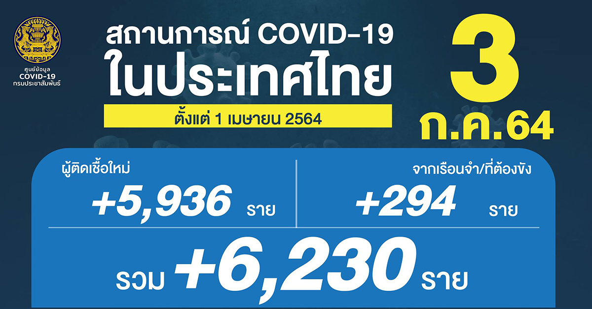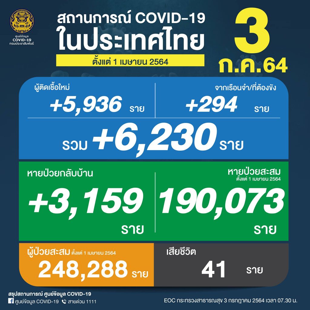 EOC กระทรวงสาธารณสุข รายงานสถานการณ์การติดเชื้อโควิด-19 รายใหม่ วันนี้ (3 ก.ค.) พบยอดผู้ติดเชื้อใหม่รวม 6,230 ราย จำแนกเป็นติดเชื้อใหม่ 5,936 ราย ติดเชื้อภายในเรือนจำ/ที่ต้องขัง 294 ราย ยืนยันสะสม 248,288 ราย (ตั้งแต่ 1 เมษายน) หายป่วยกลับบ้าน 3,159 ราย มีผู้เสียชีวิตเพิ่ม 41 ราย .-สำนักข่าวไทย