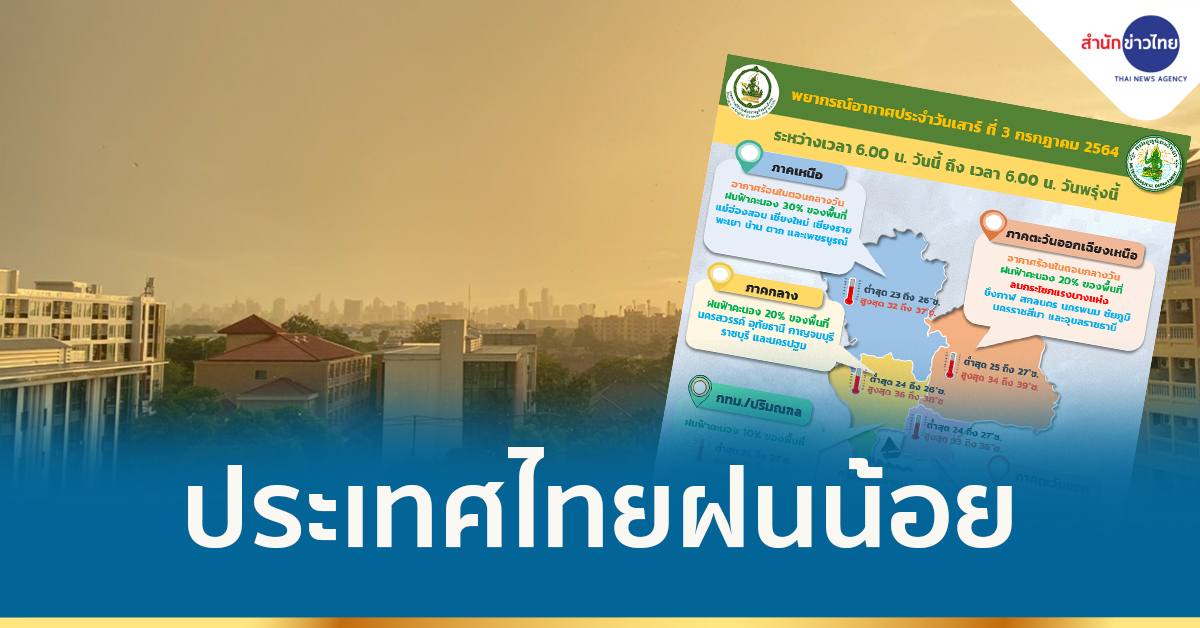 กรุงเทพฯ 3 ก.ค.-กรมอุตุฯ เผยประเทศไทยมีฝนน้อย กรุงเทพฯ – ปริมณฑล ฝนฟ้าคะนองร้อยละ 10 ของพื้นที่ อุณหภูมิสูงสุด 37 องศาเซลเซียส