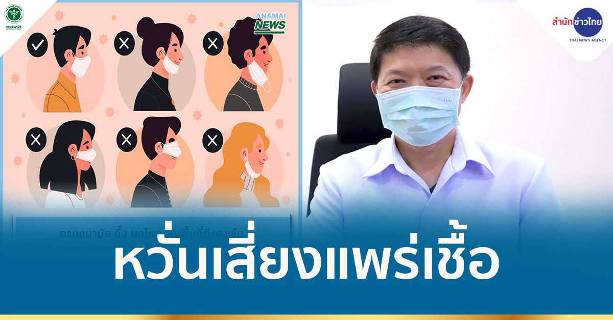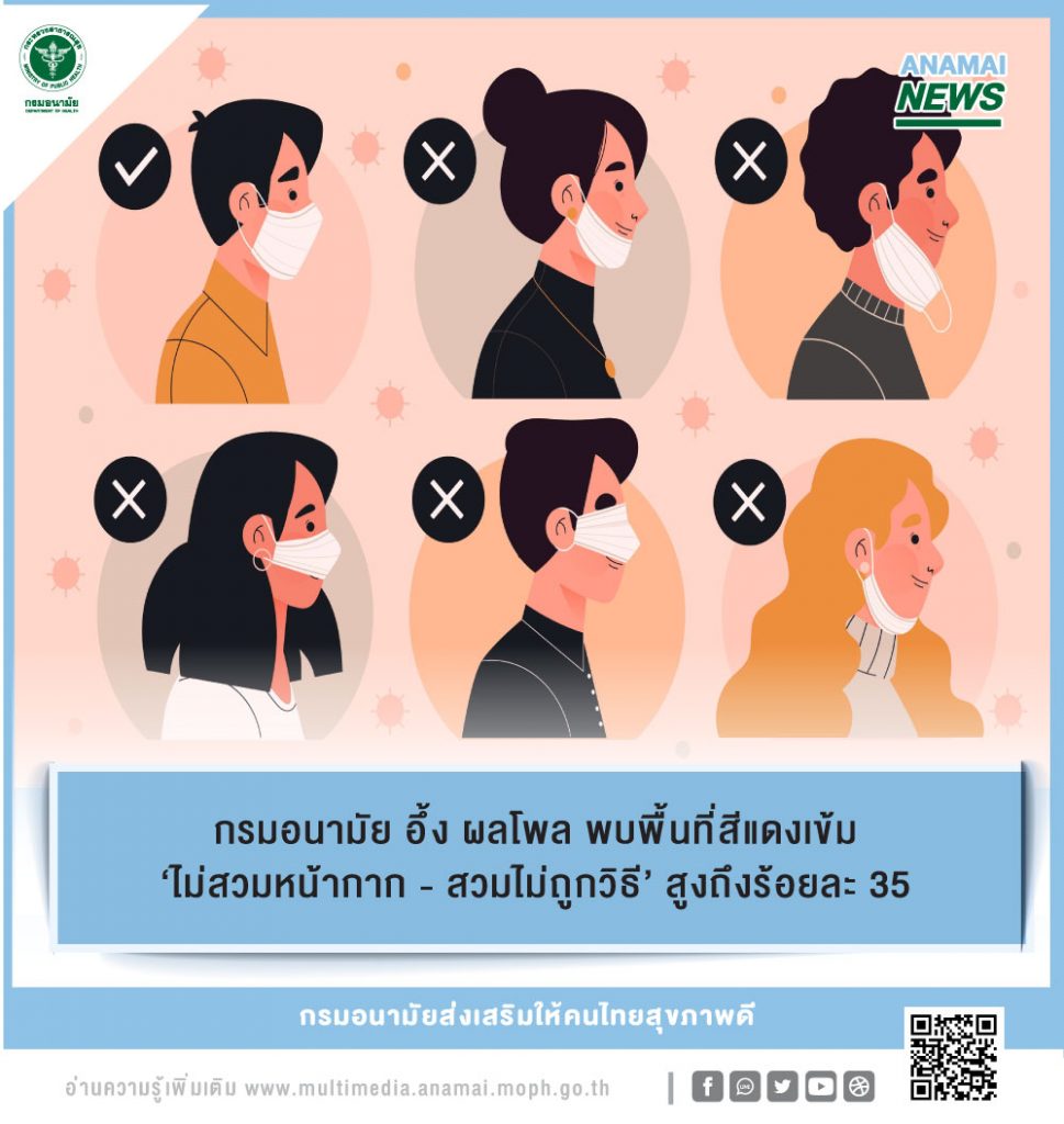 นายแพทย์สุวรรณชัย วัฒนายิ่งเจริญชัย อธิบดีกรมอนามัย เปิดเผยว่า จากผลสำรวจของอนามัยโพล เรื่องผลสำรวจการสังเกตเห็นผู้อื่นสวมหน้ากากในชุมชนละแวกที่พักสวมหน้ากากเมื่อออกนอกบ้านพบว่า ประชาชนในพื้นที่ควบคุมสูงสุดและเข้มงวด (พื้นที่สีแดงเข้ม) สวมหน้ากากถูกวิธีเพียงร้อยละ 65 ขณะที่ไม่สวมหน้ากากหรือสวมไม่ถูกวิธีพบถึงร้อยละ 35 หวั่นเป็นจุดเสี่ยงการแพร่กระจายเชื้อในชุมชน จึงขอความร่วมมือจากประชาชนในทุกพื้นที่สวมหน้ากากป้องกันตลอดเวลาและสวมให้ถูกวิธี โดยให้ปิดจมูก ปาก คาง หากสวมหน้ากากอนามัยไม่แนะนำให้สวมซ้อนกัน 2 ชั้น เนื่องจากจะทำให้ไม่กระชับกับใบหน้า เกิดช่องว่าง ทำให้ต้องใช้มือขยับและเสี่ยงสัมผัสใบหน้าบ่อย ๆ ส่งผลให้ประสิทธิภาพในการป้องกันเชื้อโรคลดลง ซึ่งวิธีการตรวจสอบความกระชับกับใบหน้าด้วยการตรวจช่องว่างโดยการเอามือแตะขอบด้านนอกของหน้ากาก พร้อมดูให้แน่ใจว่าไม่มีอากาศไหลออกจากบริเวณใกล้ดวงตาหรือจากด้านข้างของหน้ากากและถ้าสวมหน้ากากพอดีแล้ว จะรู้สึกว่ามีลมร้อนผ่านเข้ามาทางด้านหน้าของหน้ากาก และอาจเห็นหน้ากากเคลื่อนเข้าและออกทุกครั้งที่หายใจ