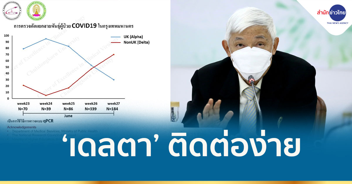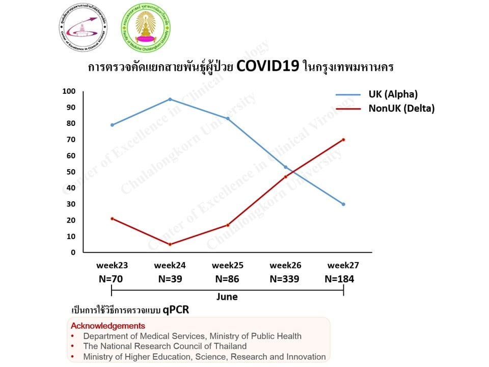 ณ ขณะนี้ที่กรุงเทพฯ จากการศึกษาวิจัยของศูนย์กว่า 700 ตัวอย่าง ในเดือนที่ผ่านมา พบว่าอัตราส่วนในการพบสายพันธุ์เดลตา สูงขึ้นเร็วมาก จนขณะนี้ส่วนใหญ่ร้อยละ 70 ของผู้ป่วยเป็นสายพันธุ์เดลตา ดังแสดงในรูป สายพันธุ์เดลตาติดต่อได้ง่ายมาก ดังนั้นในบางครั้งจะไม่รู้เลยว่ารับเชื้อมาจากที่ใด และการระบาดจะเพิ่มสูงขึ้นอีกอย่างมาก
