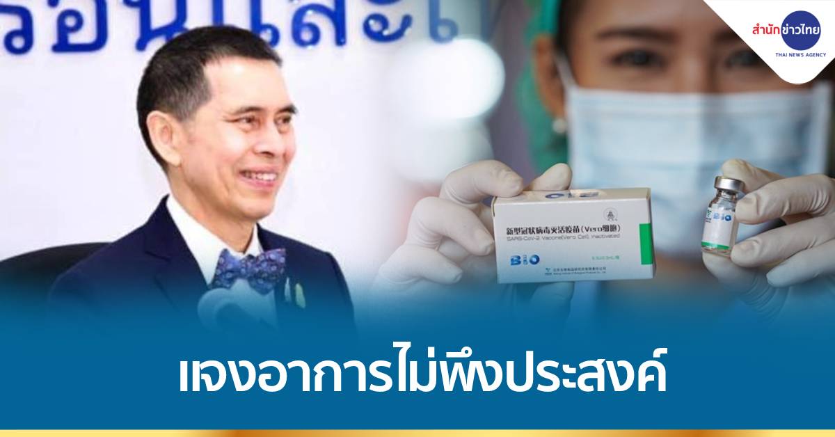 จำนวนผู้ได้รับวัคซีนซิโนฟาร์มทั่วประเทศ 67,992 ราย ร้อยละ 97 ไม่พบอาการผิดปกติ ในส่วนการเกิดอาการไม่พึงประสงค์นั้น พบว่าเกิดอาการไม่พึงประสงค์ภายใน 30 นาทีระหว่างรอสังเกตอาการหลังฉีดวัคซีน เพียง 100 รายจากทั้งหมด 67,992 รายที่รับวัคซีน คิดเป็น 0.1% เท่านั้นที่มีอาการไม่พึงประสงค์ภายใน 30 นาทีหลังรับวัคซีน และอาการที่พบบ่อยได้แก่ เวียนศรีษะ คลื่นไส้อาเจียน หายใจไม่อิ่ม ทุกรายมีอาการเพียงเล็กน้อยถึงปานกลาง