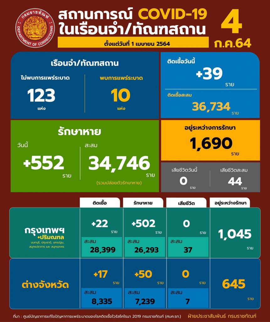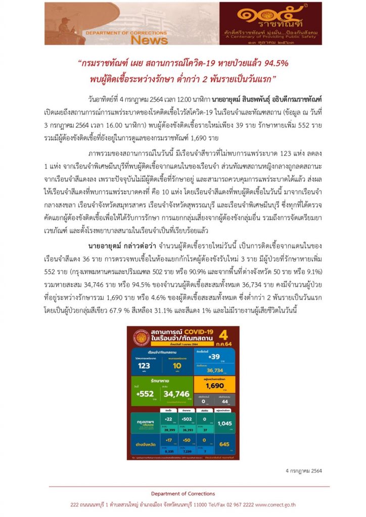 นายอายุตม์ สินธพพันธุ์ อธิบดีกรมราชทัณฑ์ เปิดเผยถึงสถานการณ์การแพร่ระบาดของโรคติดเชื้อไวรัสโควิด-19 ในเรือนจำและทัณฑสถาน (ข้อมูล ณ วันที่ 3 กรกฎาคม 2564 เวลา 16.00 น.) พบผู้ต้องขังติดเชื้อรายใหม่เพียง 39 ราย รักษาหายเพิ่ม 552 ราย รวมมีผู้ต้องขังติดเชื้อที่ยังอยู่ในการดูแลของกรมราชทัณฑ์ 1,690 ราย ภาพรวมของสถานการณ์ในวันนี้ มีเรือนจำสีขาวที่ไม่พบการแพร่ระบาด 123 แห่ง ลดลง 1 แห่ง จากเรือนจำพิเศษมีนบุรีที่พบผู้ติดเชื้อจากแดนในของเรือนจำ ส่วนทัณฑสถานหญิงกลางถูกลดสถานะจากเรือนจำสีแดงลง เพราะปัจจุบันไม่มีผู้ติดเชื้อที่รักษาอยู่ และสามารถควบคุมการแพร่ระบาดได้แล้ว ส่งผลให้เรือนจำสีแดงที่พบการแพร่ระบาดคงที่ คือ 10 แห่ง โดยเรือนจำสีแดงที่พบผู้ติดเชื้อในวันนี้ มาจากเรือนจำกลางสงขลา เรือนจำจังหวัดสมุทรสาคร เรือนจำจังหวัดสุพรรณบุรี และเรือนจำพิเศษมีนบุรี ซึ่งทุกที่ได้ตรวจคัดแยกผู้ต้องขังติดเชื้อเพื่อให้ได้รับการรักษา การแยกกลุ่มเสี่ยงจากผู้ต้องขังกลุ่มอื่น รวมถึงการจัดเตรียมยา เวชภัณฑ์ และตั้งโรงพยาบาลสนามในเรือนจำเป็นที่เรียบร้อยแล้ว