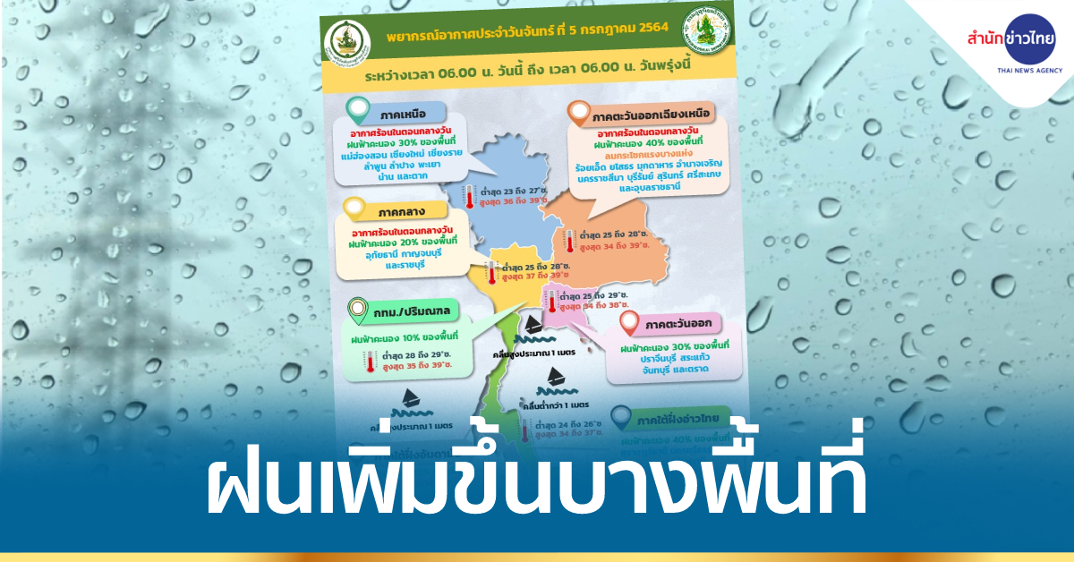 กทม. 5 ก.ค.-กรมอุตุฯ เผยภาคอีสาน ตะวันออก และภาคใต้มีฝนเพิ่มขึ้น ส่วน กทม.-ปริมณฑล ฝน 10% ของพื้นที่ อุณหภูมิสูงสุด 39 องศาฯ