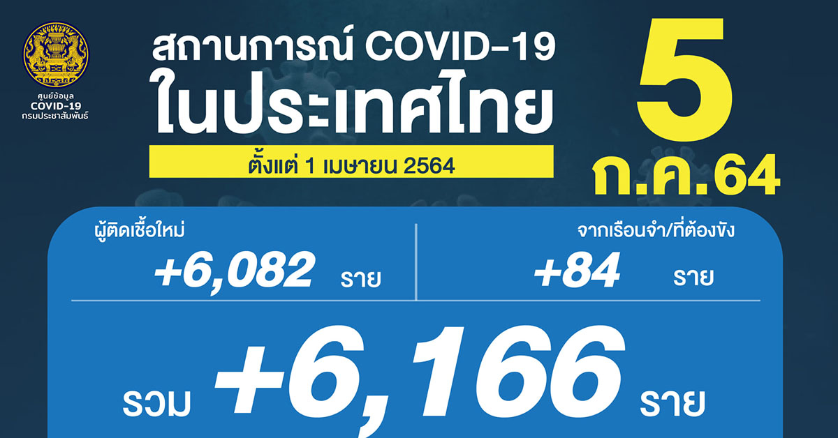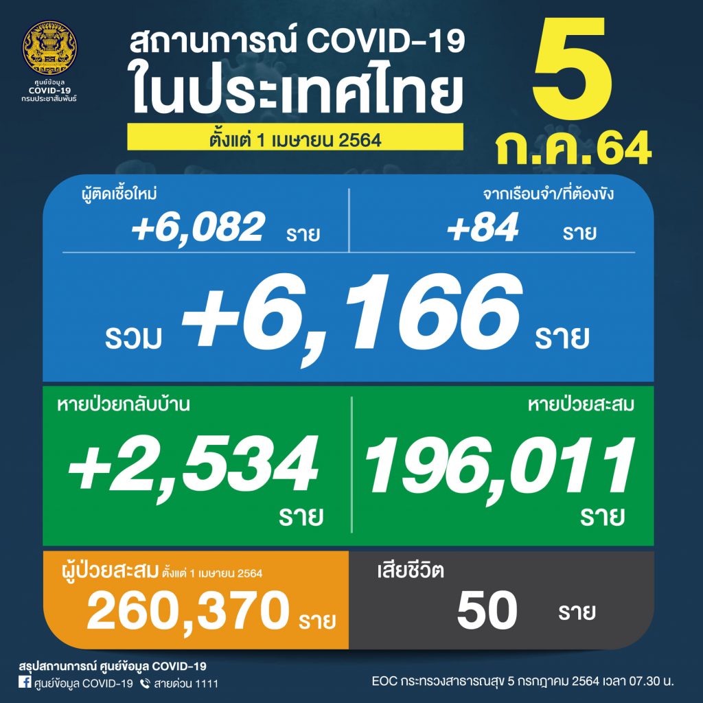 กรุงเทพฯ 5 ก.ค.-โควิดวันนี้ ยอดยังพุ่งสูง ติดเชื้อรวม 6,166 ราย ยืนยันสะสม 260,370 ราย (ตั้งแต่ 1 เมษายน) หายป่วยกลับบ้าน 2,534 ราย เสียชีวิตเพิ่ม 50 ราย