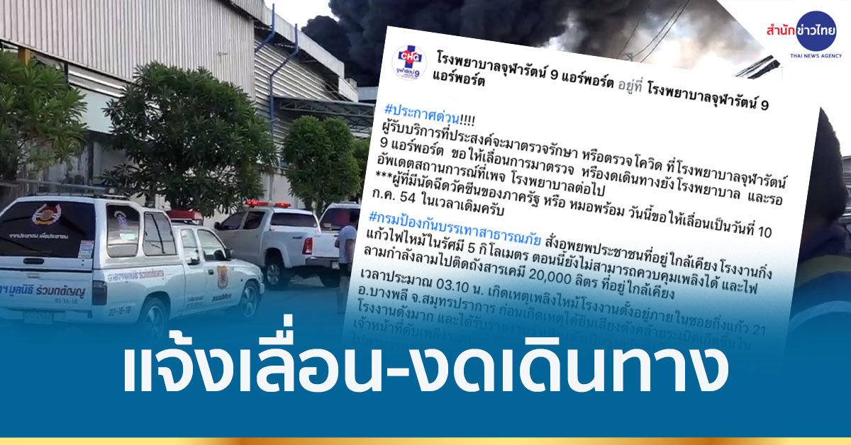 กรุงเทพฯ 5 ก.ค.- รพ.จุฬารัตน์ 9 แอร์พอร์ต ซึ่งอยู่ในรัศมีเหตุโรงงานกิ่งแก้วไฟไหม้ โพสต์ประกาศด่วนแจ้งเลื่อนการตรวจรักษา หรือตรวจโควิดออกไปก่อน และงดเดินทางมายัง รพ.เนืองจากกรมป้องกันและบรรเทาสาธารณภัยสั่งอพยพประชาชนที่อยู่ใกล้เคียงโรงงานกิ่งแก้วไฟไหม้ในรัศมี 5 กิโลเมตร