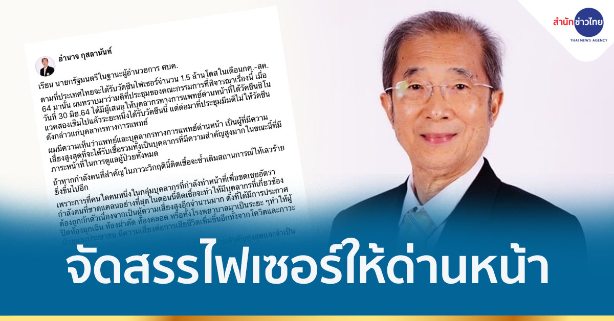 กรุงเทพฯ 5 ก.ค.- อดีตนายกแพทยสภา ร้องนายกรัฐมนตรี จัดสรรวัคซีนไฟเซอร์ให้บุคลากรทางการแพทย์ด่านหน้า ในฐานะผู้มีความเสี่ยงสูงสุดที่จะได้รับเชื้อโควิด-19 รวมทั้งเป็นบุคลากรที่มีความสำคัญสูงมากในขณะนี้ที่มีภาระหน้าที่ในการดูแลผู้ป่วยทั้งหมด