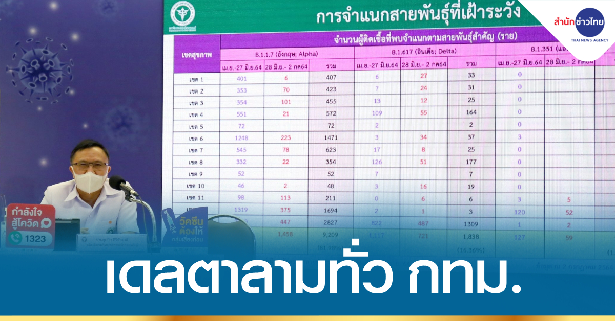 นพ.ศุภกิจ ศิริลักษณ์ อธิบดีกรมวิทยาศาสตร์การแพทย์ กระทรวงสาธารณสุข (สธ.) เปิดเผยว่า กรมวิทยาศาสตร์การแพทย์ ร่วมกับเครือข่ายห้องปฏิบัติการเฝ้าระวังสายพันธุ์โควิด-19 ในประเทศไทย โดยจากข้อมูลการเฝ้าระวัง ระหว่างวันที่ 28 มิ.ย. ถึงวันที่ 2 ก.ค.64 พบว่า ในพื้นที่กรุงเทพฯ พบสายพันธุ์เดลตา (อินเดีย) มีแนวโน้มเพิ่มขึ้นอย่างรวดเร็ว โดยพบ 487 ราย (52%) ส่วนสายพันธุ์อัลฟา (อังกฤษ) 447 ราย (47.8%) และสายพันธุ์เบตา (แอฟริกาใต้) 2 ราย (0.2%) โดยผู้ป่วยสายพันธุ์เบตาทั้ง 2 ราย เป็นครอบครัวเดียวกับที่พบรายแรกที่ติดเชื้อจากลูกชายที่เดินทางมาจาก จ.นราธิวาส