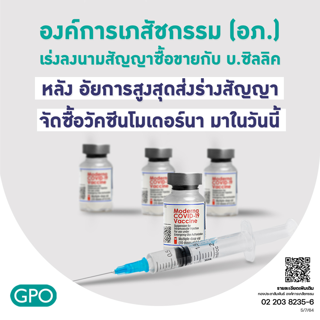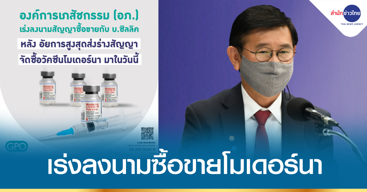 กรุงเทพฯ 5 ก.ค. – องค์การเภสัชกรรม เร่งลงนามสัญญาซื้อขายกับ บ.ซิลลิคฯ หลังอัยการสูงสุดส่งร่างสัญญาจัดซื้อวัคซีน “โมเดอร์นา” มาในวันนี้