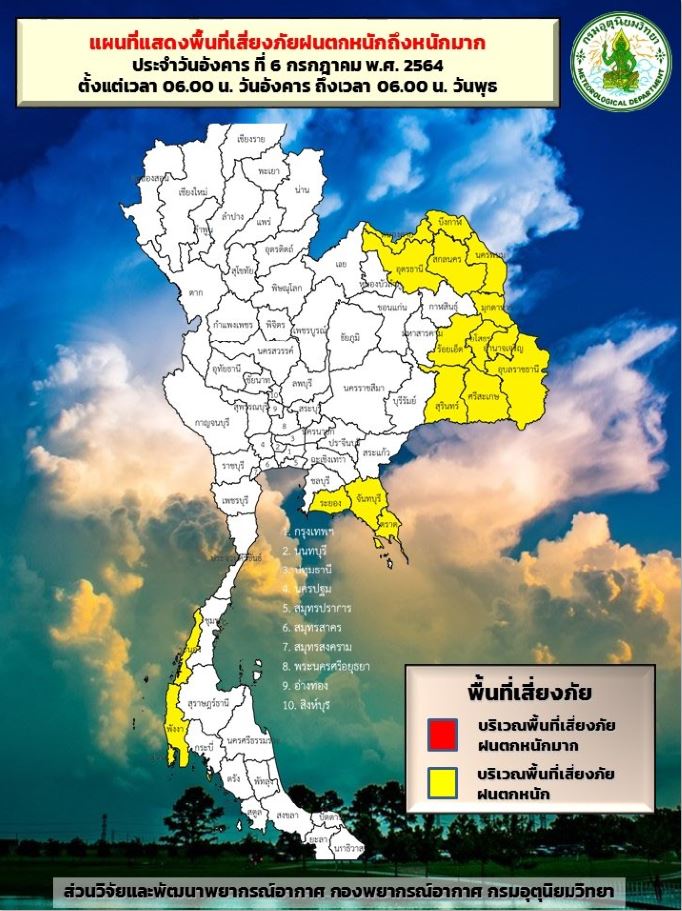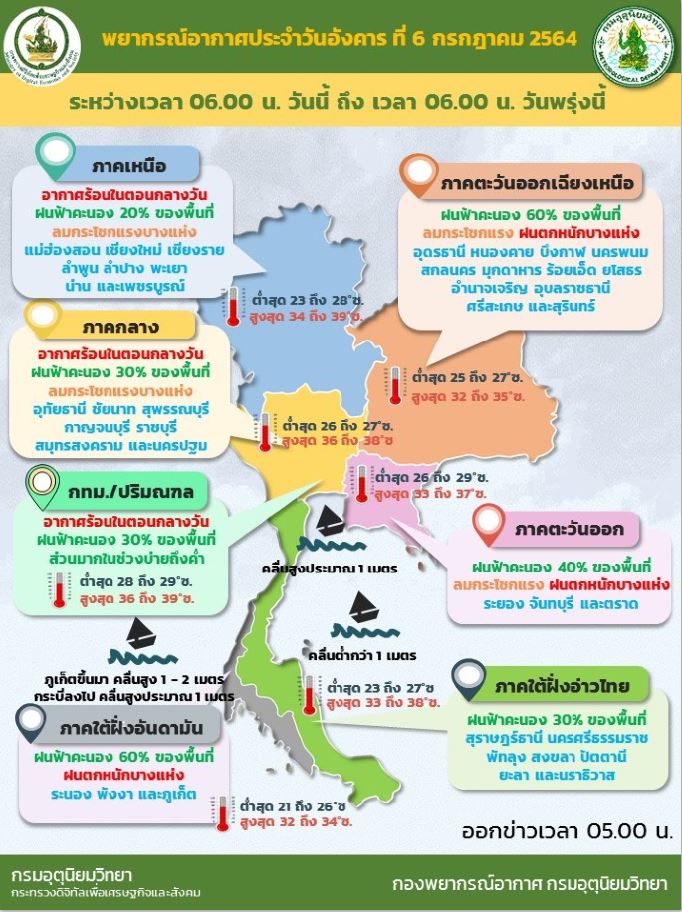 กรมอุตุนิยมวิทยา พยากรณ์อากาศ 24 ชั่วโมงข้างหน้า มรสุมตะวันตกเฉียงใต้ที่พัดปกคลุมทะเลอันดามัน ประเทศไทย และอ่าวไทย เริ่มมีกำลังแรงขึ้น ประกอบกับร่องมรสุมพาดผ่านตอนบนของภาคเหนือและภาคตะวันออกเฉียงเหนือ เข้าสู่หย่อมความกดอากาศต่ำกำลังแรงปกคลุมบริเวณทะเลจีนใต้ตอนกลาง ทำให้บริเวณประเทศไทยมีฝนเพิ่มมากขึ้น โดยมีฝนตกหนักบางแห่ง
