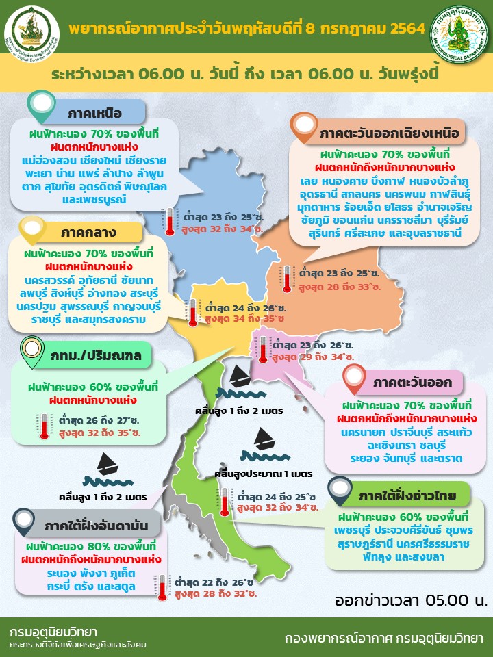 กรมอุตุนิยมวิทยา พยากรณ์อากาศ 24 ชั่วโมงข้างหน้า ประเทศไทยมีฝนเพิ่มมากขึ้น กับมีฝนตกหนักถึงหนักมากบางแห่งบริเวณภาคเหนือ ภาคตะวันออกเฉียงเหนือ ภาคกลาง ภาคตะวันออก และภาคใต้ฝั่งตะวันตก ขอให้ประชาชนในพื้นที่เสี่ยงภัยบริเวณดังกล่าวระวังอันตรายจากฝนตกหนักและฝนตกสะสม ซึ่งอาจทำให้เกิดน้ำท่วมฉับพลันและน้ำป่าไหลหลากได้ เนื่องจากมีร่องมรสุมพาดผ่านภาคเหนือและภาคตะวันออกเฉียงเหนือ เข้าสู่หย่อมความกดอากาศต่ำกำลังแรงบริเวณชายฝั่งอ่าวตังเกี๋ย ประเทศเวียดนามตอนบน ประกอบกับมรสุมตะวันตกเฉียงใต้ที่พัดปกคลุมทะเลอันดามัน ประเทศไทย และอ่าวไทย มีกำลังปานกลาง สำหรับคลื่นลมบริเวณทะเลอันดามันและอ่าวไทยตอนบน มีคลื่นสูง 1-2 เมตร บริเวณที่มีฝนฟ้าคะนองคลื่นสูงมากกว่า 2 เมตร