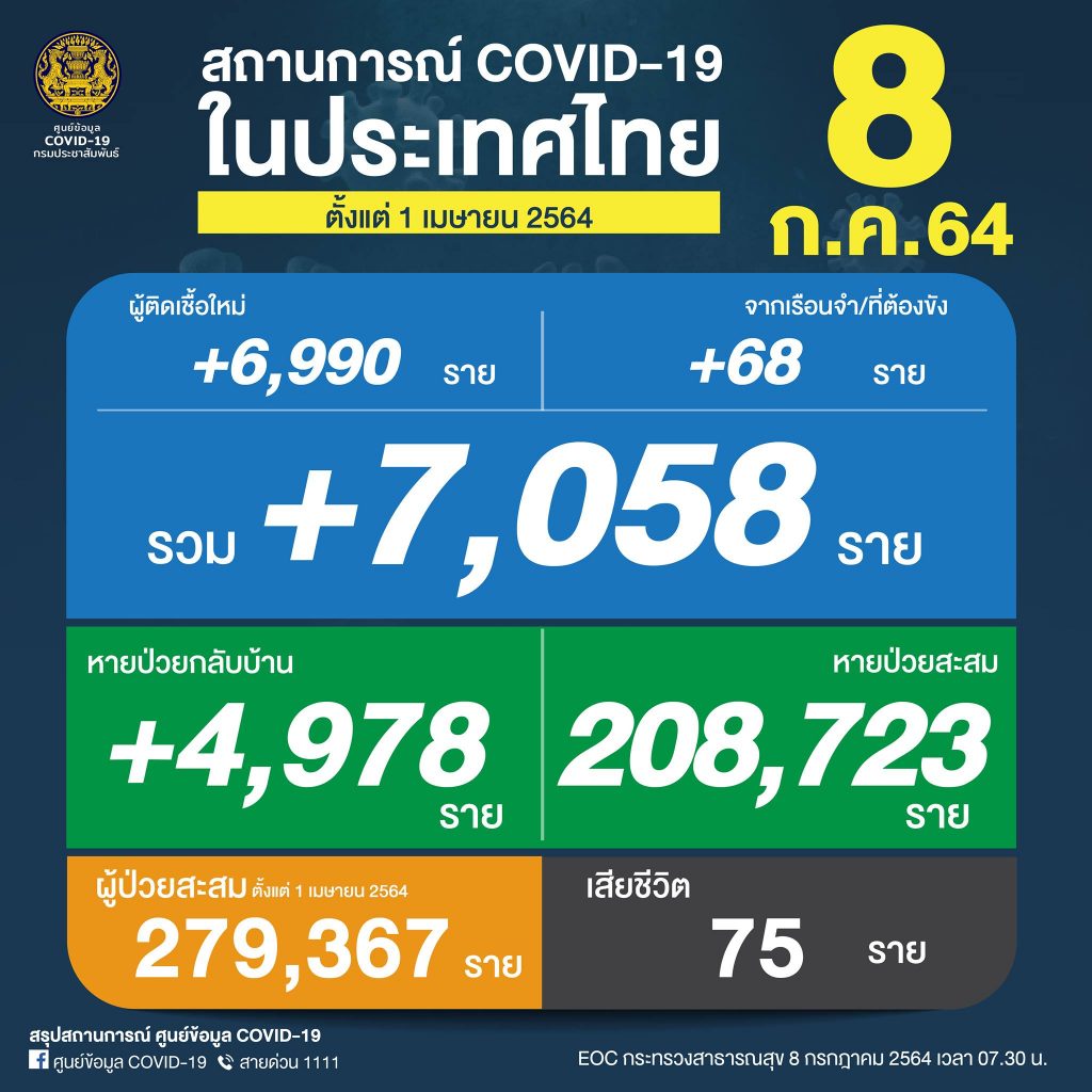 EOC กระทรวงสาธารณสุข รายงานสถานการณ์การติดเชื้อโควิด-19 รายใหม่ วันนี้ (8 ก.ค.) พบยอดผู้ติดเชื้อใหม่รวม 7,058 ราย จำแนกเป็นติดเชื้อใหม่ 6,990 ราย ติดเชื้อภายในเรือนจำ/ที่ต้องขัง 68 ราย ยืนยันสะสม 279,367 ราย (ตั้งแต่ 1 เมษายน) หายป่วยกลับบ้าน 4,978 ราย มีผู้เสียชีวิตเพิ่ม 75 ราย ทั้งนี้ เวลา 12.30 น. ศบค. จะแถลงรายละเอียดอย่างเป็นทางการอีกครั้ง .-สำนักข่าวไทย