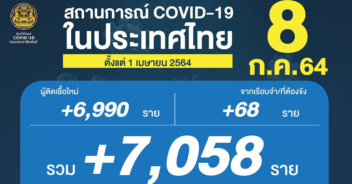 กรุงเทพฯ 8 ก.ค.-โควิดวันนี้ ทำสถิตินิวไฮ ยอดผู้ติดเชื้อรวม 7,058 ราย ยืนยันสะสม 279,367 ราย (ตั้งแต่ 1 เมษายน) หายป่วยกลับบ้าน 4,978 ราย เสียชีวิตเพิ่ม 75 ราย