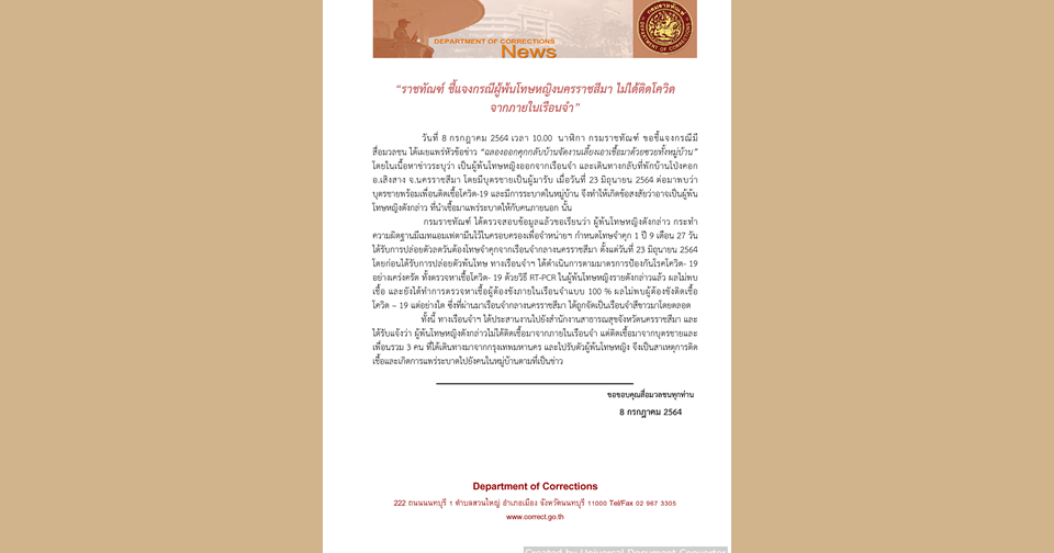 กรมราชทัณฑ์ ได้ตรวจสอบข้อมูลแล้วขอเรียนว่า ผู้พ้นโทษหญิงดังกล่าว กระทำความผิดฐานมีเมทแอมเฟตามีนไว้ในครอบครองเพื่อจำหน่ายกำหนดโทษจำคุก 1 ปี 9 เดือน 27 วันได้รับการปล่อยตัวลดวันต้องโทษจำคุกจากเรือนจำกลางนครราชสีมา ตั้งแต่วันที่ 23 มิถุนายน 2564โดยก่อนได้รับการปล่อยตัวพ้นโทษ ทางเรือนจำฯ ได้ดำเนินการตามมาตรการป้องกันโรคโควิด-19 อย่างเคร่งครัด ทั้งตรวจหาเชื้อโควิด- 19 ด้วยวิธี RT-PCR ในผู้พ้นโทษหญิงรายดังกล่าวแล้ว ผลไม่พบเชื้อ และยังได้ทำการตรวจหาเชื้อผู้ต้องขังภายในเรือนจำแบบ 100 % ผลไม่พบผู้ต้องขังติดเชื้อโควิด – 19 แต่อย่างใด ซึ่งที่ผ่านมาเรือนจำกลางนครราชสีมา ได้ถูกจัดเป็นเรือนจำสีขาวมาโดยตลอด