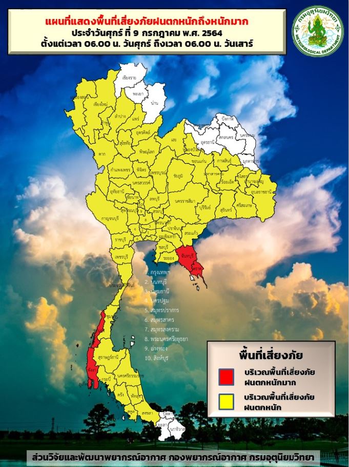 กรมอุตุนิยมวิทยา พยากรณ์อากาศ 24 ชั่วโมงข้างหน้า ประเทศไทยมีฝนฟ้าคะนองหลายพื้นที่ กับมีฝนตกหนักถึงหนักมากบางแห่งบริเวณภาคเหนือ ภาคตะวันออกเฉียงเหนือ ภาคกลาง ภาคตะวันออก และภาคใต้ ขอให้ประชาชนในพื้นที่เสี่ยงภัยบริเวณดังกล่าวระวังอันตรายจากฝนตกหนักและฝนตกสะสม ซึ่งอาจทำให้เกิดน้ำท่วมฉับพลันและน้ำป่าไหลหลากได้ เนื่องจากมีร่องมรสุมพาดผ่านภาคเหนือ ภาคตะวันออกเฉียงเหนือ และภาคกลางตอนบน ประกอบกับมรสุมตะวันตกเฉียงใต้ที่พัดปกคลุมทะเลอันดามัน ประเทศไทย และอ่าวไทย มีกำลังค่อนข้างแรง