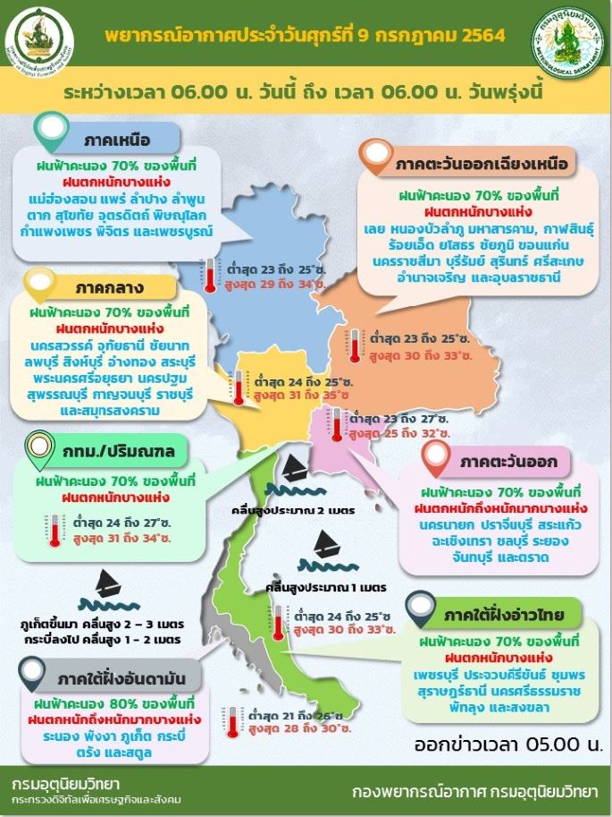 สำหรับคลื่นลมบริเวณทะเลอันดามันตอนบนตั้งแต่จังหวัดภูเก็ตขึ้นมา ทะเลมีคลื่นสูง 2-3 เมตร บริเวณที่มีฝนฟ้าคะนองคลื่นสูงมากกว่า 3 เมตร ส่วนอ่าวไทยตอนบนมีคลื่นสูงประมาณ 2 เมตร บริเวณที่มีฝนฟ้าคะนองคลื่นสูงมากกว่า 2 เมตร ขอให้ชาวเรือบริเวณทะเลอันดามันและอ่าวไทยตอนบนระมัดระวังอันตรายในการเดินเรือบริเวณที่มีฝนฟ้าคะนอง และเรือเล็กบริเวณทะเลอันดามันตอนบนควรงดออกจากฝั่งจนถึงวันที่ 13 ก.ค. 64