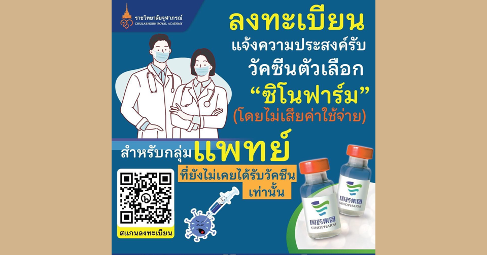 ราชวิทยาลัยจุฬาภรณ์ โพสต์เฟซบุ๊กขอเชิญแพทย์ที่ยังไม่เคยได้รับการฉีดวัคซีนป้องกันโควิด และมีความประสงค์ที่จะเข้ารับการฉีดวัคซีนเป็นเข็มแรก สามารถลงทะเบียนแจ้งความประสงค์เพื่อเข้ารับวัคซีนซิโนฟาร์มกับราชวิทยาลัยจุฬาภรณ์ ได้ทาง https://bit.ly/FormForDoc โดยไม่เสียค่าใช้จ่าย