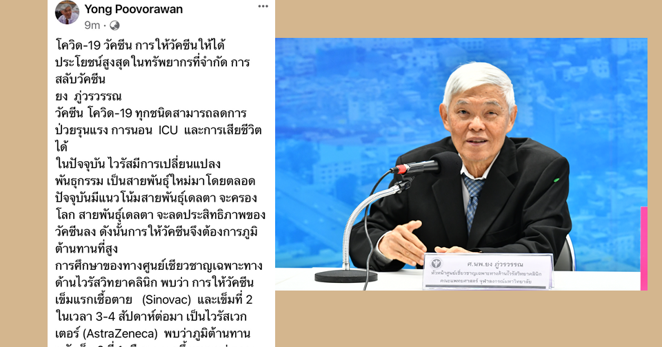 ศ.นพ.ยง ภู่วรวรรณ หรือ “หมอยง” หัวหน้าศูนย์เชี่ยวชาญเฉพาะทางด้านไวรัสวิทยาคลินิก ภาควิชากุมารเวชศาสตร์ คณะแพทยศาสตร์ จุฬาลงกรณ์มหาวิทยาลัย โพสต์ผ่านเฟซบุ๊ก Yong Poovorawan เรื่อง โควิด-19 วัคซีน การให้วัคซีนให้ได้ประโยชน์สูงสุดในทรัพยากรที่จำกัด การสลับวัคซีน โดยมีรายละเอียดว่า วัคซีน โควิด-19 ทุกชนิดสามารถลดการป่วยรุนแรง การนอน ICU และการเสียชีวิตได้