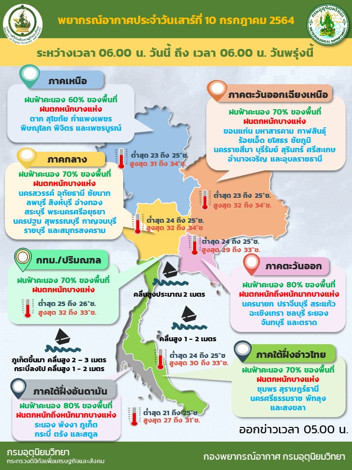 สำหรับคลื่นลมบริเวณทะเลอันดามันตอนบนตั้งแต่จังหวัดภูเก็ตขึ้นมา ทะเลมีคลื่นสูง 2-3 เมตร บริเวณที่มีฝนฟ้าคะนองคลื่นสูงมากกว่า 3 เมตร ส่วนอ่าวไทยตอนบนมีคลื่นสูงประมาณ 2 เมตร บริเวณที่มีฝนฟ้าคะนองคลื่นสูงมากกว่า 2 เมตร ขอให้ชาวเรือบริเวณทะเลอันดามันและอ่าวไทยตอนบนระมัดระวังอันตรายในการเดินเรือบริเวณที่มีฝนฟ้าคะนอง และเรือเล็กบริเวณทะเลอันดามันตอนบนควรงดออกจากฝั่งจนถึงวันที่ 12 ก.ค. 64
