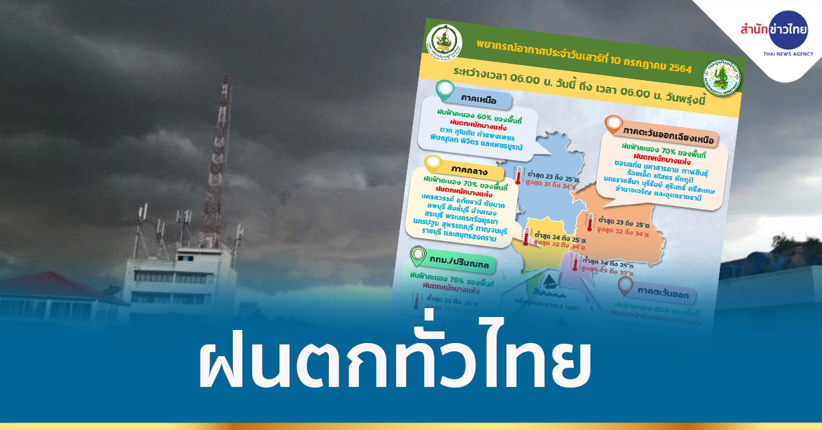 กรุงเทพฯ 10 ก.ค.-กรมอุตุฯ เตือนฝนตกต่อเนื่องทั่วทุกภาคของไทย ระวังน้ำท่วมฉับพลันและน้ำป่าไหลหลาก ภาคใต้คลื่นสูง 2-3 เมตร ส่วน กทม.-ปริมณฑล ฝนร้อยละ 70