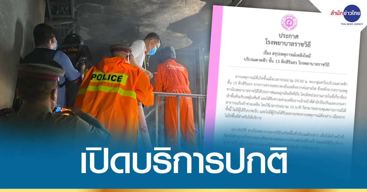 ทั้งนี้ ไม่มีผู้ได้รับบาดเจ็บ และไม่มีผู้ป่วยได้รับผลกระทบจากเหตุการณ์ดังกล่าว เนื่องจากไม่ใช่บริเวณพื้นที่ให้บริการ แต่โรงพยาบาลราชวิถีจะปิดพื้นที่บริเวณดังกล่าว เพื่อให้เจ้าหน้าที่พิสูจน์หลักฐานเข้าตรวจสอบหาสาเหตุของไฟไหม้อีกครั้ง ทั้งนี้ ขอให้วางใจโรงพยาบาลยังสามารถให้บริการได้ตามปกติ. – สำนักข่าวไทย