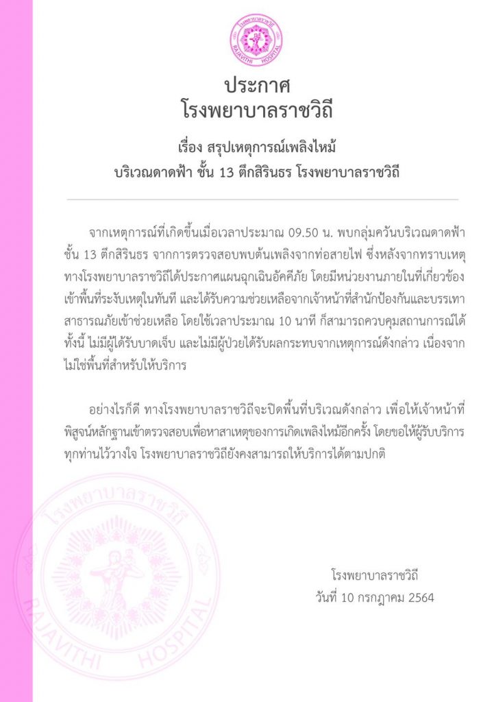 โรงพยาบาลราชวิถี ชี้แจงเหตุไฟไหม้ที่เกิดขึ้น เมื่อเวลาประมาณ 09.50 น. บริเวณดาดฟ้า ชั้น 13 ตึกสิรินธร พบต้นเพลิงจากท่อสายไฟ ซึ่งทางโรงพยาบาลได้ประกาศแผนฉุกเฉินอัคคีภัย โดยมีหน่วยงานภายในที่เกี่ยวข้องเข้าพื้นที่ระงับเหตุในทันที และได้รับความช่วยเหลือจากเจ้าหน้าที่สำนักป้องกันและบรรเทาสาธารณภัยเข้าช่วยเหลือ โดยใช้เวลาประมาณ 10 นาที ก็สามารถควบคุมสถานการณ์ได้