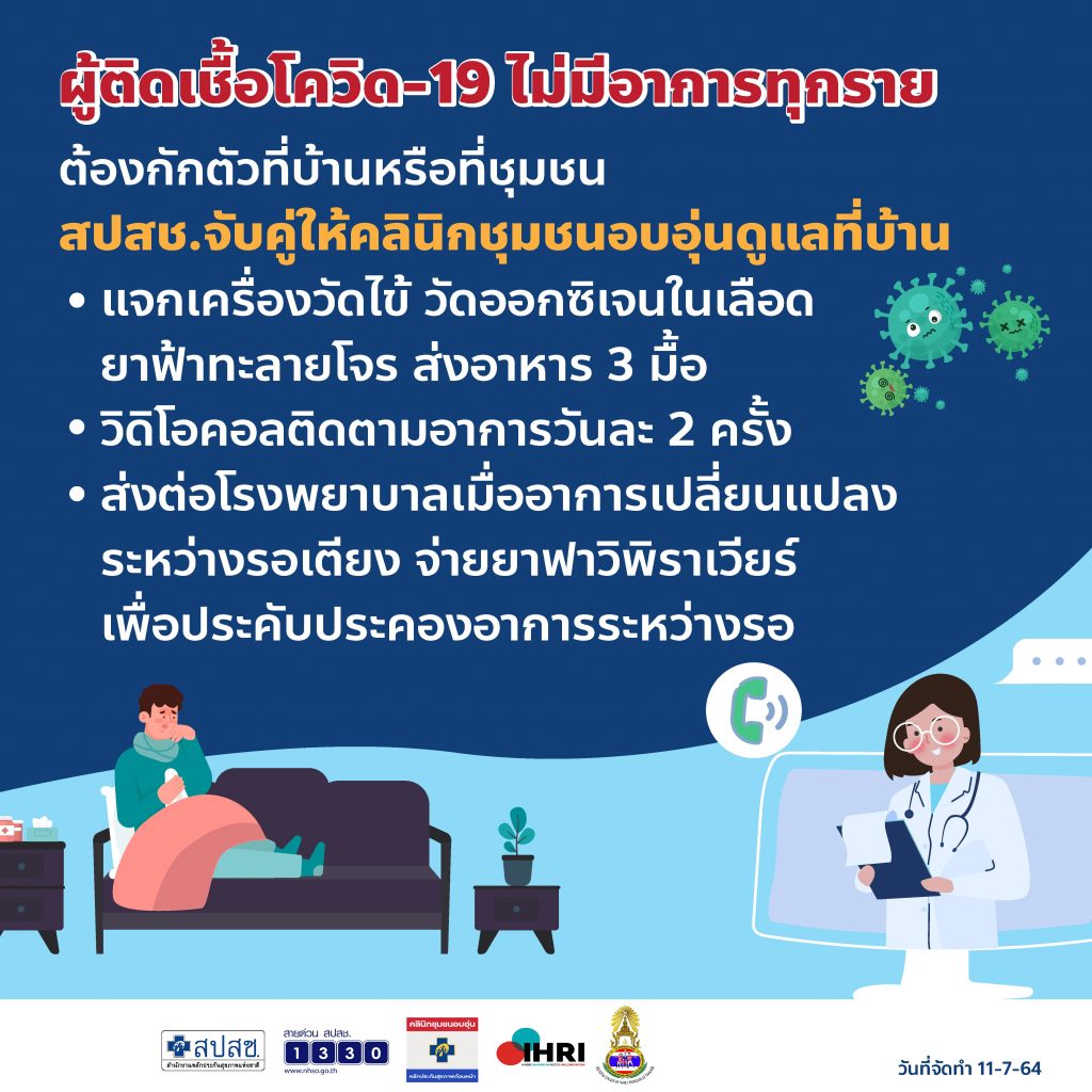 ดังนั้น สปสช.จึงได้ปรับแนวทางการดูแล โดยจากเดิมจะสอบถามความสมัครใจผู้ติดเชื้อกลุ่มสีเขียวซึ่งไม่แสดงอาการหรือแสดงอาการเล็กน้อยก่อน ว่ายินดีเข้าระบบการดูแลรักษาที่บ้าน (Home Isolation) หรือที่ชุมชน (Community Isolation) หรือไม่ แต่ตั้งแต่วันจันทร์ที่ 12 ก.ค. 2564 เป็นต้นไป ผู้ป่วยที่ตกค้างรอหาเตียงอยู่ในระบบของ 1330 จะเข้าสู่ระบบการดูแลรักษาที่บ้านทั้งหมด ภายใต้การดูแลของคลินิกชุมชนอบอุ่นในพื้นที่ที่ผู้ป่วยพักอาศัย ซึ่งการดูแลจะเป็นไปตามมาตรฐานของแพทย์เวชศาสตร์ครอบครัว