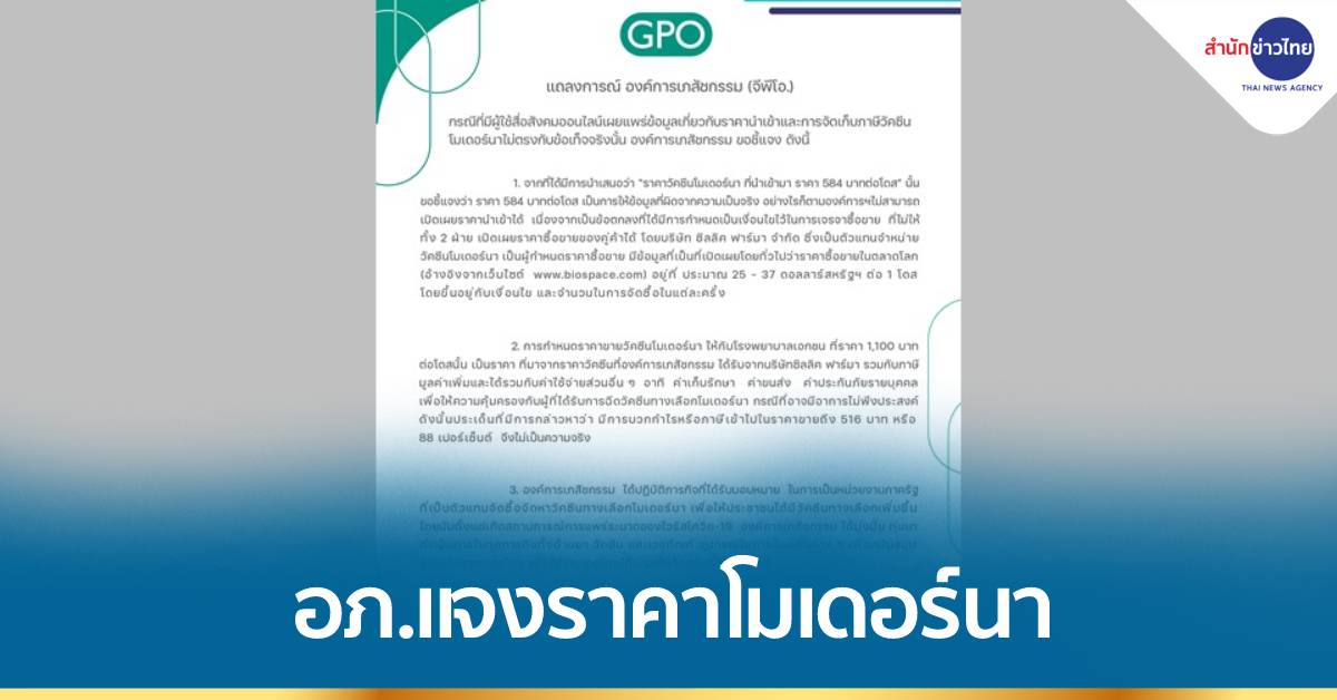 กองประชาสัมพันธ์ องค์การเภสัชกรรม เผยแพร่แถลงการณ์องค์การเภสัชกรรม (จีพีโอ) ไปยังสื่อมวลชน โดยมีรายละเอียดว่า กรณีที่มีผู้ใช้สื่อสังคมออนไลน์เผยแพร่ข้อมูลเกี่ยวกับราคานำเข้าและการจัดเก็บภาษีวัคซีนโมเดอร์นา ไม่ตรงกับข้อเท็จจริงนั้น องค์การเภสัชกรรม ขอชี้แจง ดังนี้