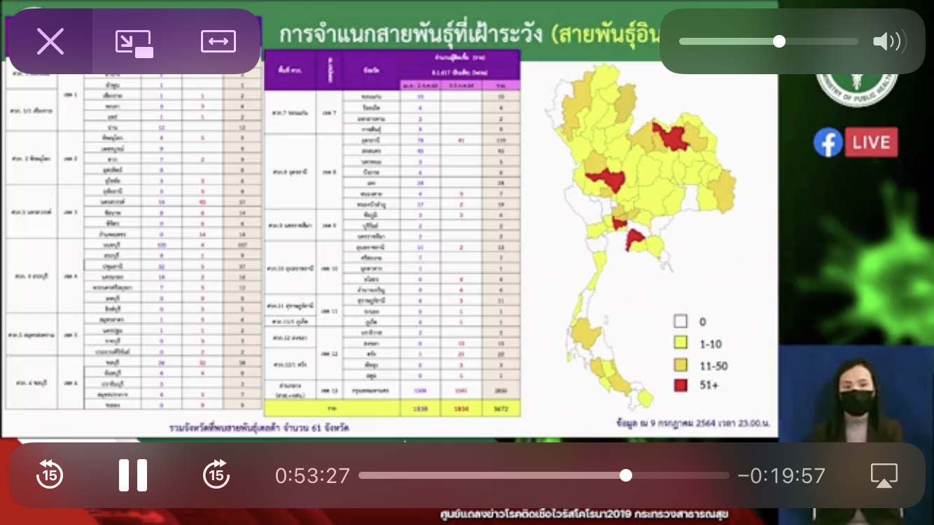 นพ.ศุภกิจ ศิริลักษณ์ อธิบดีกรมวิทยาศาสตร์การแพทย์ กระทรวงสาธารณสุข กล่าวว่า จากการตรวจหาหาสายพันธุ์การระบาดของโควิด-19 ในไทย โดยมีการตรวจสอบไปกว่า15,000 ตัวอย่าง พบว่าขณะนี้สายพันธุ์การระบาดของไทย แม้จะยังเป็นอัลฟา ร้อยละ 74 แต่พบว่าสัดส่วนของเดลตา อยู่ที่ร้อยละ 46 คาดว่าไม่นานก็จะค่อยๆ กระจายเพิ่มสัดส่วนและเข้ามาแทนที่อัลฟาได้ไม่นาน โดยการพบเชื้อเดลตา ขณะนี้พบมากสุดในแถบอีสาน อุดรธานี และนครสวรรค์ จังหวัดละ 40 คน รองลงมา ชลบุรี 32 คน