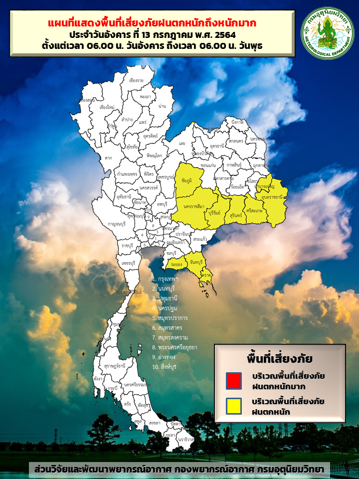 กรมอุตุฯ 13 ก.ค. – กรมอุตุฯ เผยไทยมีฝนลดลง แต่ยังคงมีฝนตกหนักบางแห่ง บริเวณภาคอีสาน และภาคตะวันออก ส่วนกรุงเทพฯ และปริมณฑล ฝนฟ้าคะนอง 30% ของพื้นที่