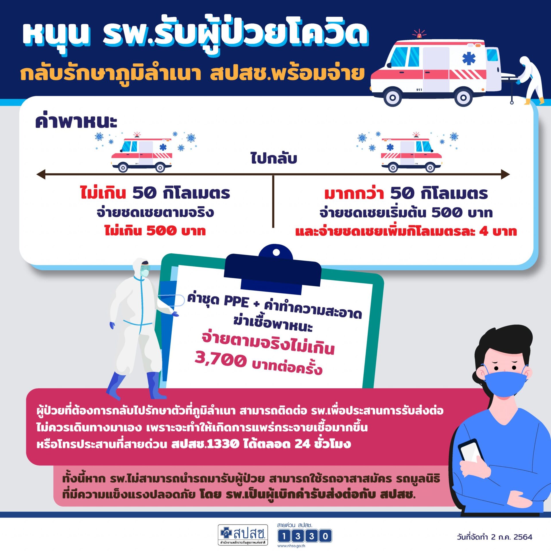 “โรงพยาบาลที่พร้อมรับผู้ป่วยโควิดกลับไปรักษาตามภูมิลำเนา สามารถจัดรถมารับผู้ป่วยได้ทันที และเบิกจ่ายค่าพาหนะรับส่งต่อผู้ป่วย รวมถึงค่าชุด PPE และค่าทำความสะอาดฆ่าเชื้อมาที่ สปสช.ได้ แต่หากโรงพยาบาลไม่สามารถนำรถมารับผู้ป่วย สามารถใช้รถอาสาสมัคร รถมูลนิธิ ที่มีความแข็งแรง ปลอดภัย โดย รพ.เป็นผู้เบิกค่ารับส่งต่อกับ สปสช.ได้เช่นเดียวกัน” เลขาธิการ สปสช. กล่าวและว่า ขณะนี้ก็กำลังหารือกับสถาบันการแพทย์ฉุกเฉินแห่งชาติ การรถไฟแห่งประเทศไทย รวมทั้งโรงพยาบาลบางแห่งที่สามารถจัดหารถได้ เช่น โรงพยาบาลสิชล จ.นครศรีธรรมราช โดยมาเบิกค่าพาหนะได้จาก สปสช.