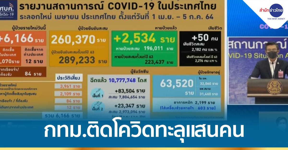 ศบค. รายงานสถานการณ์ผู้ป่วยติดเชื้อโควิด-19 ในประเทศไทย วันนี้ระบุยอดติดเชื้อรายใหม่สูงสุดยังคงเป็น กทม. ที่ 2,631 คน รวมสะสมทะลุ 101,575 คน และยังพบการระบาดกลุ่มคลัสเตอร์ใหม่ในจังหวัดสมุทรสาคร อำเภอเมือง ที่โรงงานผลิตภัณฑ์จากโลหะ 9 คน โรงงานผลิตอุปกรณ์ล็อก 8 คน จังหวัดนนทบุรี อำเภอบางบัวทอง ที่คลังห้างซูเปอร์มาร์เก็ต 312 คน จังหวัดชลบุรี อำเภอบ้านบึง ที่โรงงานเฟอร์นิเจอร์ 14 คน และจังหวัดปัตตานี ซึ่งกระจายไป 3 จังหวัด จากโรงเรียนสอนศาสนา พบ 29 คน ส่วนยอดการฉีดวัคซีนโควิด-19 ตั้งแต่วันที่ 28 กุมภาพันธ์-12 กรกฎาคม สะสม 12,908,193 โดส.-สำนักข่าวไทย