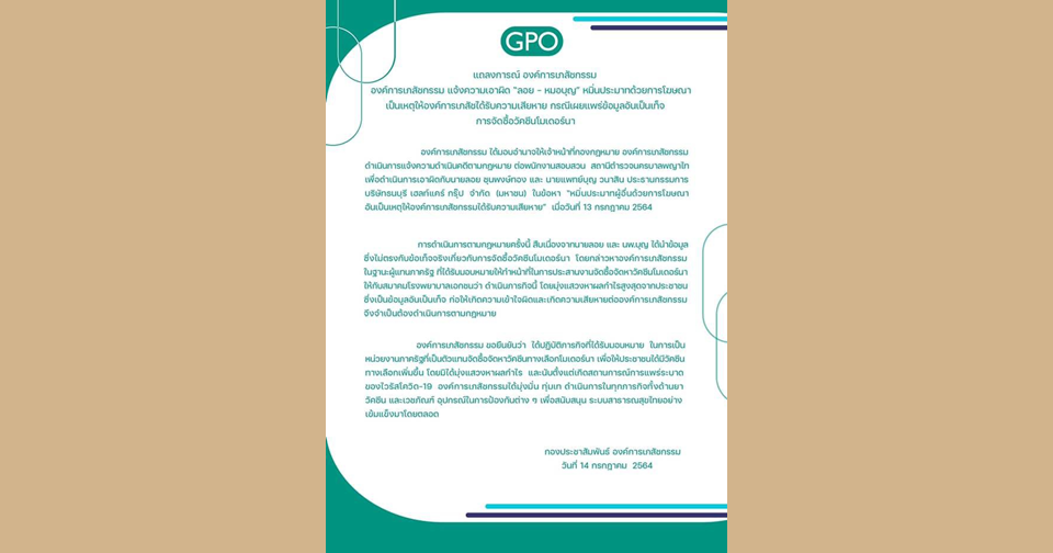การดำเนินการตามกฎหมายครั้งนี้ เนื่องจาก นายลอย และ นพ.บุญ ได้นำข้อมูลซึ่งไม่ตรงกับข้อเท็จจริงเกี่ยวกับการจัดซื้อวัคซีนโมเดอร์นา โดยกล่าวหาองค์การเภสัชกรรม ในฐานะผู้แทนภาครัฐ ที่ได้รับมอบหมายให้ทำหน้าที่ในการประสานงานจัดซื้อจัดหาวัคซีนโมเดอร์นาให้กับสมาคมโรงพยาบาลเอกชนว่าดำเนินภารกิจนี้ โดยมุ่งแสวงหาผลกำไรสูงสุดจากประชาชน ซึ่งเป็นข้อมูลอันเป็นเท็จ ก่อให้เกิดความเข้าใจผิดและเกิดความเสียหายต่อองค์การเภสัชกรรม จึงจำเป็นต้องดำเนินการตามกฎหมาย