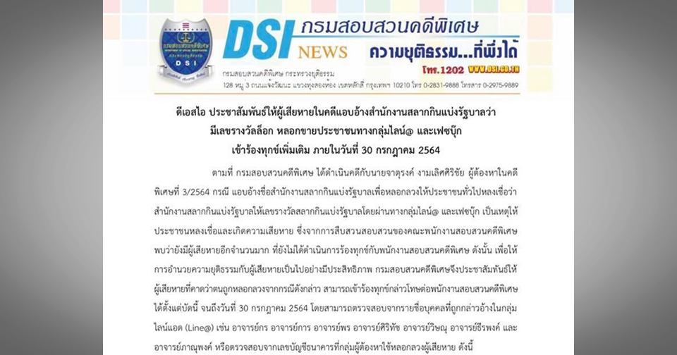 กรุงเทพฯ 14 ก.ค.-ดีเอสไอ แจ้งเหยื่อถูกหลอกเลขล็อก เข้าร้องทุกข์กล่าวโทษได้ ตั้งแต่บัดนี้จนถึง 30 ก.ค.64