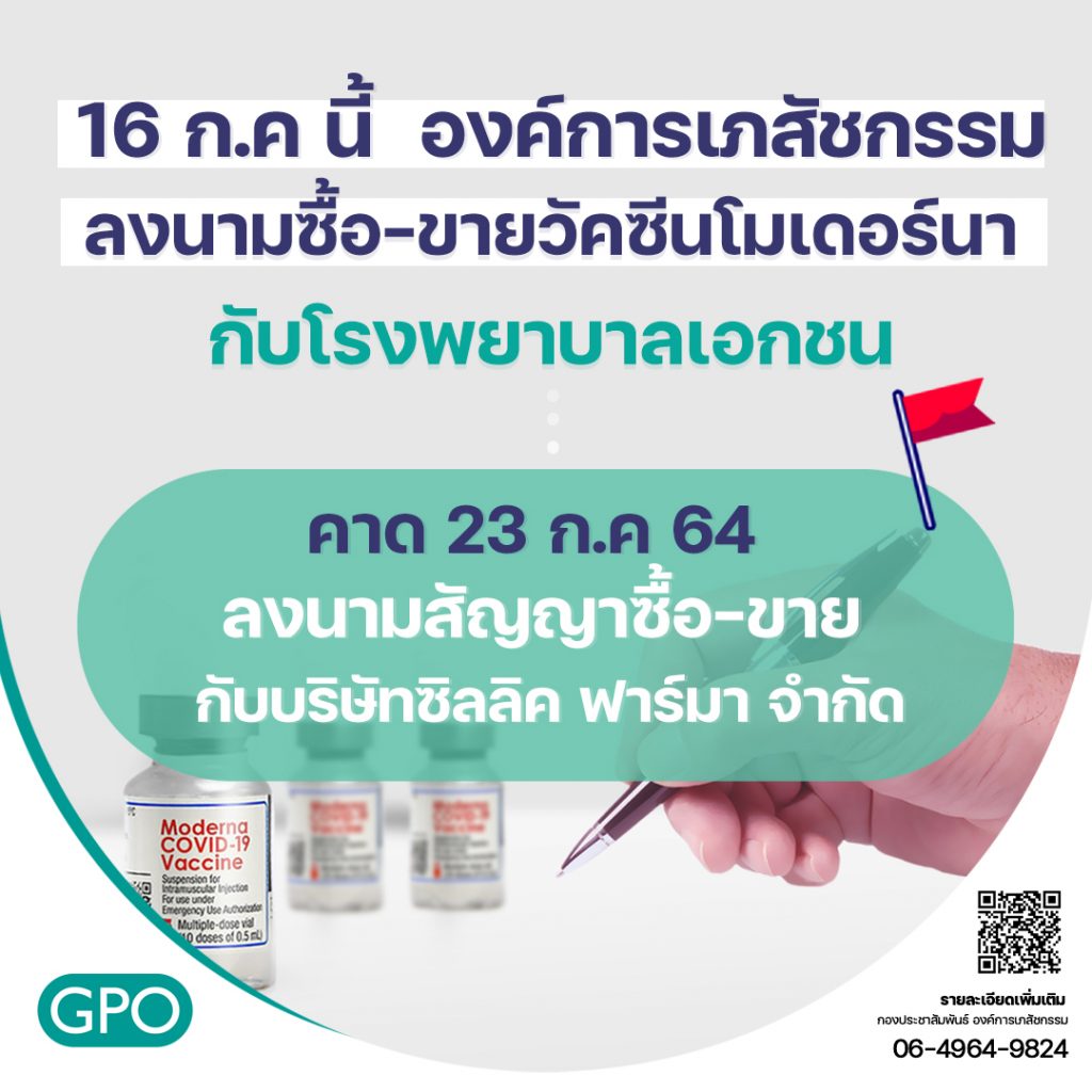 กรุงเทพฯ 14 ก.ค.- องค์การเภสัชกรรม (จีพีโอ) เผย 16 ก.ค.นี้ เริ่มลงนามซื้อ-ขายวัคซีนโมเดอร์นากับโรงพยาบาลเอกชน พร้อมคาด 23 ก.ค. ลงนามสัญญาซื้อ-ขาย กับบริษัทซิลลิค ฟาร์มา จำกัด