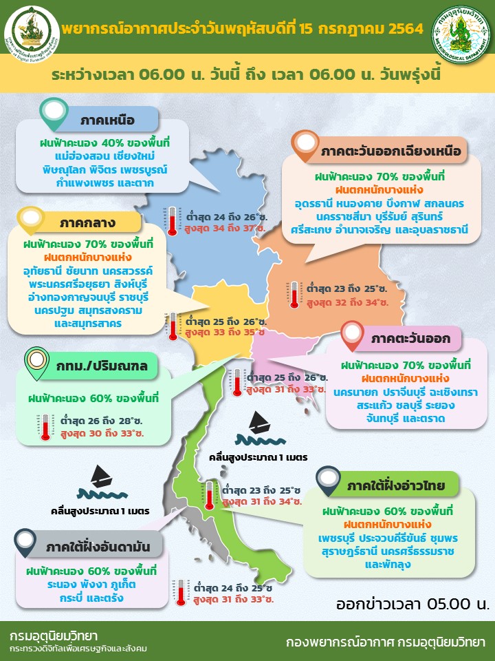 กรมอุตุฯ 15 ก.ค. – กรมอุตุฯ เผยภาคอีสานตอนล่าง ภาคกลาง ภาคตะวันออก และภาคใต้ ฝนตกหนักบางแห่ง ส่วนกรุงเทพฯ-ปริมณฑล ฝนฟ้าคะนอง 60% ของพื้นที่