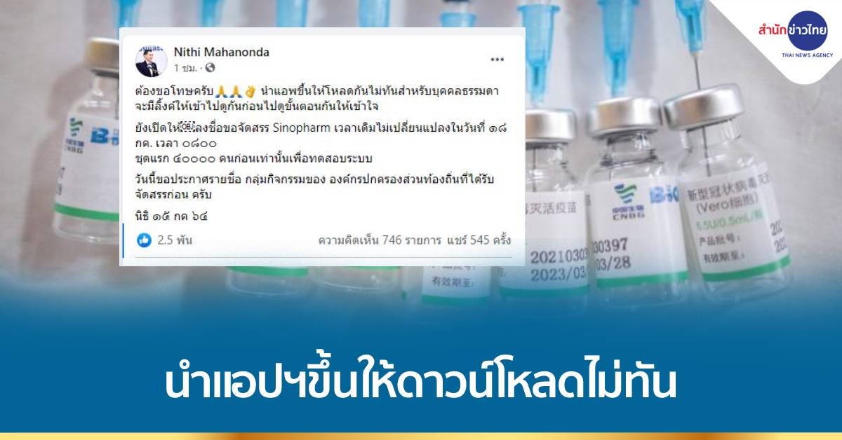 กทม. 15 ก.ค.-ศ.นพ.นิธิ ขอโทษนำแอปฯ ขึ้นให้โหลดกันไม่ทันวันนี้ แต่ยังเปิดให้ลงชื่อขอจัดสรร Sinopharm เวลาเดิมไม่เปลี่ยนแปลงในวันที่ 18 ก.ค. เวลา 08.00 น. ชุดแรก 40,000 คน