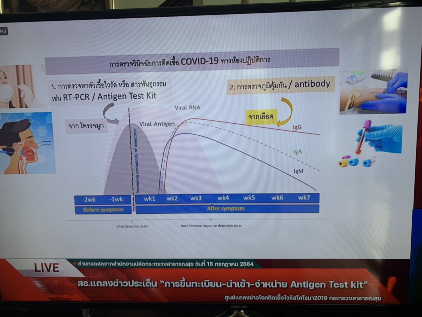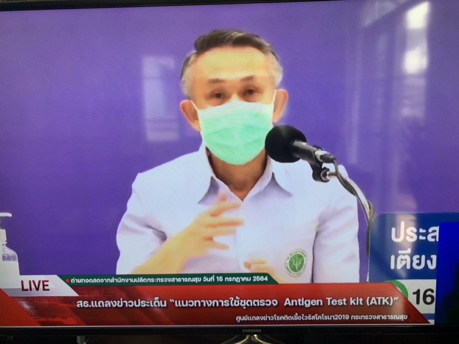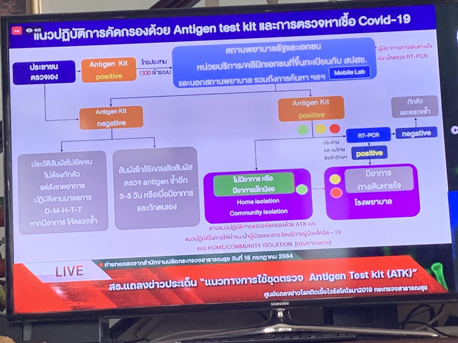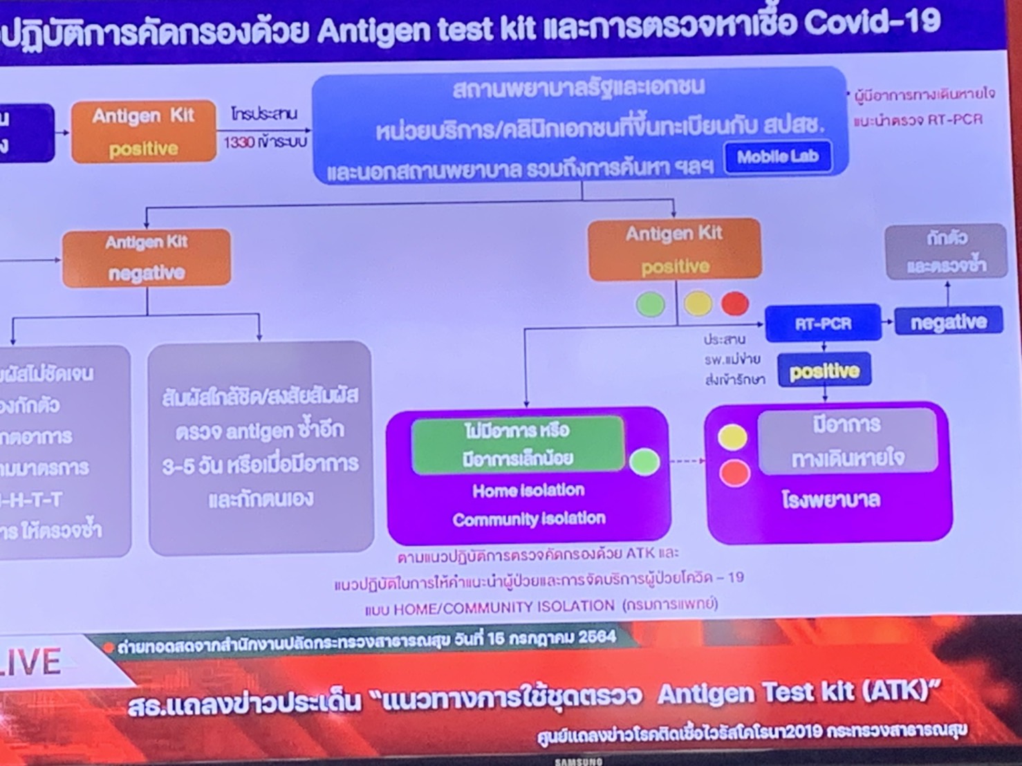 นพ.ธงชัย กีรติหัตถาการ รองปลัดกระทรวงสาธารณสุข (รองปลัด สธ.) แถลงแนวปฏิบัติการคัดกรองด้วย Antigen Test Kit ว่าเพื่อทำให้รู้ผลได้รวดเร็วขึ้นโดยเฉพาะในชุมชน สาเหตุที่เพิ่งเริ่มนำมาใช้เพราะขณะนี้มีจำนวนผู้ติดเชื้อโควิดเพิ่มมากขึ้น การรอตรวจไม่เพียงพอประชาชนมีความต้องการอยากรู้ผลตรวจตัวเองมากขึ้น ข้อดีคือตรวจได้ง่ายและรู้ผลรวดเร็วภายใน 30 นาที เมื่อพบผลบวกจะสามารถเข้าสู่ระบบการรักษาได้รวดเร็วทั้ง Home Isolation ,Community Isolation ที่มีระบบส่งเครื่องวัดออกซิเจนปลายนิ้ว,เครื่องวัดอุณหภูมิ,และยาฟ้าทะลายโจร ,ฟาวิพิราเวียร์ให้ ที่บ้าน มี วิดีโอคอลสอบถามอาการ 2 ครั้งต่อวัน และหากอาการหนักขึ้น ให้ติดต่อ 1330 หรือ 1668 จะมีทีมนำตัวเข้ารักษายังสถานพยาบาล