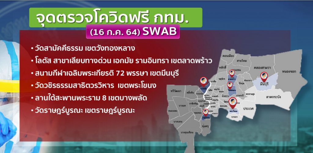 สำหรับจุดตรวจคัดกรองโควิดเชิงรุกฟรี ในพื้นที่กรุงเทพมหานคร โดยการตรวจแบบ SWAB ในจุดต่างๆ วันนี้ มีที่วัดสามัคคีธรรม เขตวังทองหลาง, โลตัส สาขาเลียบทางด่วน เอกมัยขรามอินทรา เขตลาดพร้าว, สนามกีฬาเฉลิมพระเกียรติ 72 พรรษา เขตมีนบุรี, วัดวชิรธรรมสาธิตวรวิหาร เขตพระโขนง , ลานใต้สะพานพระราม 8 เขตบางพลัด , วัดราษฎร์บูรณะ เขตราษฎร์บูรณะ. – สำนักข่าวไทย
