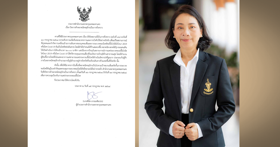 นางวัลยา วัฒนรัตน์ รองปลัดกรุงเทพมหานคร แจ้งว่า ตามที่ได้มีประกาศกรุงเทพมหานคร เรื่อง สั่งปิดสถานที่เป็นการชั่วคราว (ฉบับที่ 36) ลงวันที่ 10 กรกฎาคม 2564 ยกระดับความเข้มข้นของมาตรการและการบังคับใช้อย่างจริงจัง เพื่อแก้ไขสถานการณ์ที่มุ่งลดและจำกัดการเคลื่อนย้ายการเดินทางของบุคคลเพื่อลดการระบาดของโรคติดเชื้อไวรัสโคโรนา 2019 หรือโรค Covid 19 อันเป็นโรคติดต่ออันตราย โดยมีคำสั่งกำหนดให้ร้านสะดวกซื้อ ตลาดนัด ตลาดโต้รุ่ง ถนนคนเดิน ให้เปิดดำเนินการได้จนถึงเวลา 20.00 น. แต่เนื่องจากปัจจุบันสถานการณ์การแพร่ระบาดของเชื้อไวรัสโคโรนา 2019 หรือโรค Covid 19 ได้ทวีความรุนแรงจนเสี่ยงที่จะเกิดภาวะวิกฤติด้านสาธารณสุข โดยมีจำนวนผู้ติดเชื้อรายใหม่ซึ่งไม่แสดงอาการแต่สามารถแพร่กระจายเชื้อโรคได้ง่ายในอัตราเร่งที่สูงมาก ประกอบกับผู้ค้าภายในตลาดนัดจตุจักรจำนวนมากมีภูมิลำเนาอยู่ต่างจังหวัดที่จะต้องเดินทางข้ามเขตพื้นที่จังหวัด