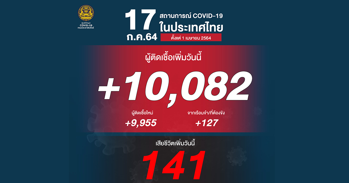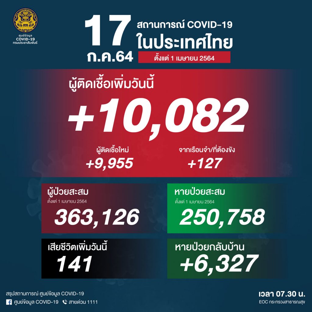 EOC กระทรวงสาธารณสุข รายงานสถานการณ์การติดเชื้อโควิด-19 รายใหม่ วันนี้ (17 ก.ค.) พบยอดผู้ติดเชื้อใหม่รวม 10,082 ราย จำแนกเป็นติดเชื้อใหม่ 9,955 ราย ติดเชื้อภายในเรือนจำ/ที่ต้องขัง 127 ราย ยืนยันสะสม 363,126 ราย (ตั้งแต่ 1 เมษายน) หายป่วยกลับบ้าน 6,327 ราย มีผู้เสียชีวิตเพิ่ม 141 ราย .-สำนักข่าวไทย