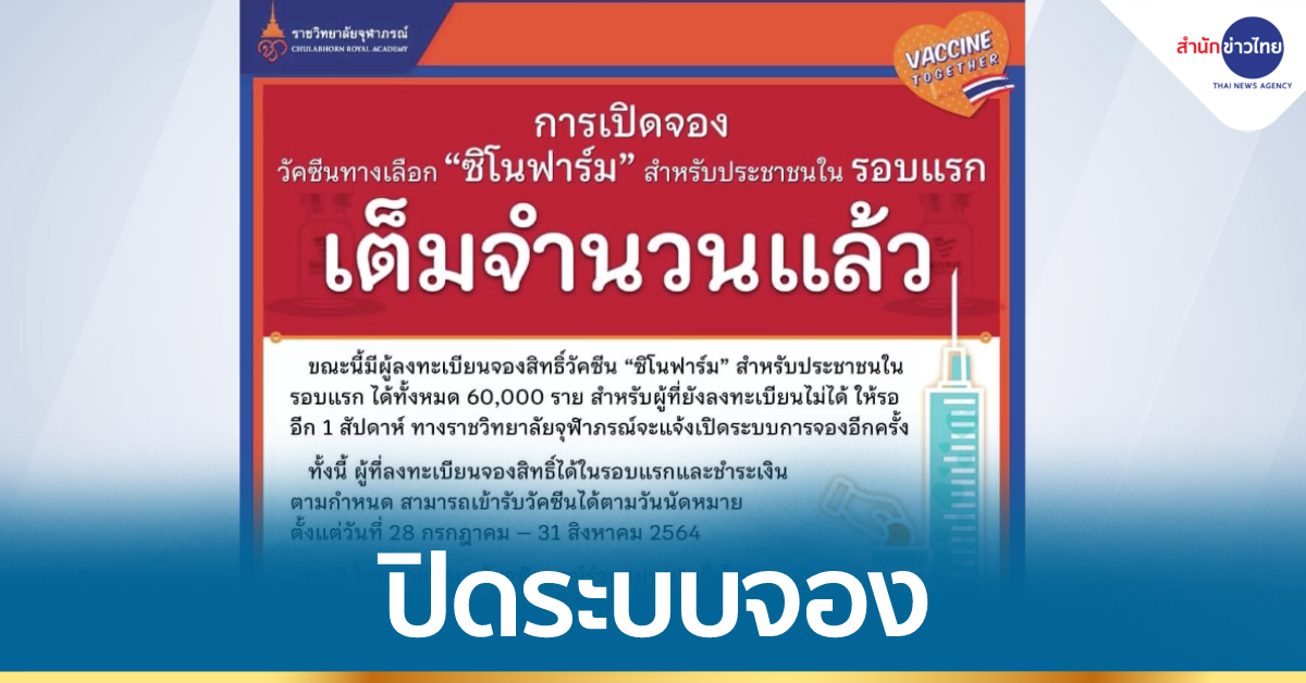 กรุงเทพฯ 18 ก.ค.- ศ.นพ.นิธิ มหานนท์ เลขาธิการราชวิทยาลัยจุฬาภรณ์ โพสต์เฟซบุ๊กว่าปิดระบบจองวัคซีนซิโนฟาร์มเเล้วในเวลา 9.30 น. พร้อมขอโทษผู้ที่จองไม่ได้และจะขยายระบบการเข้าจองให้กว้างขึ้น