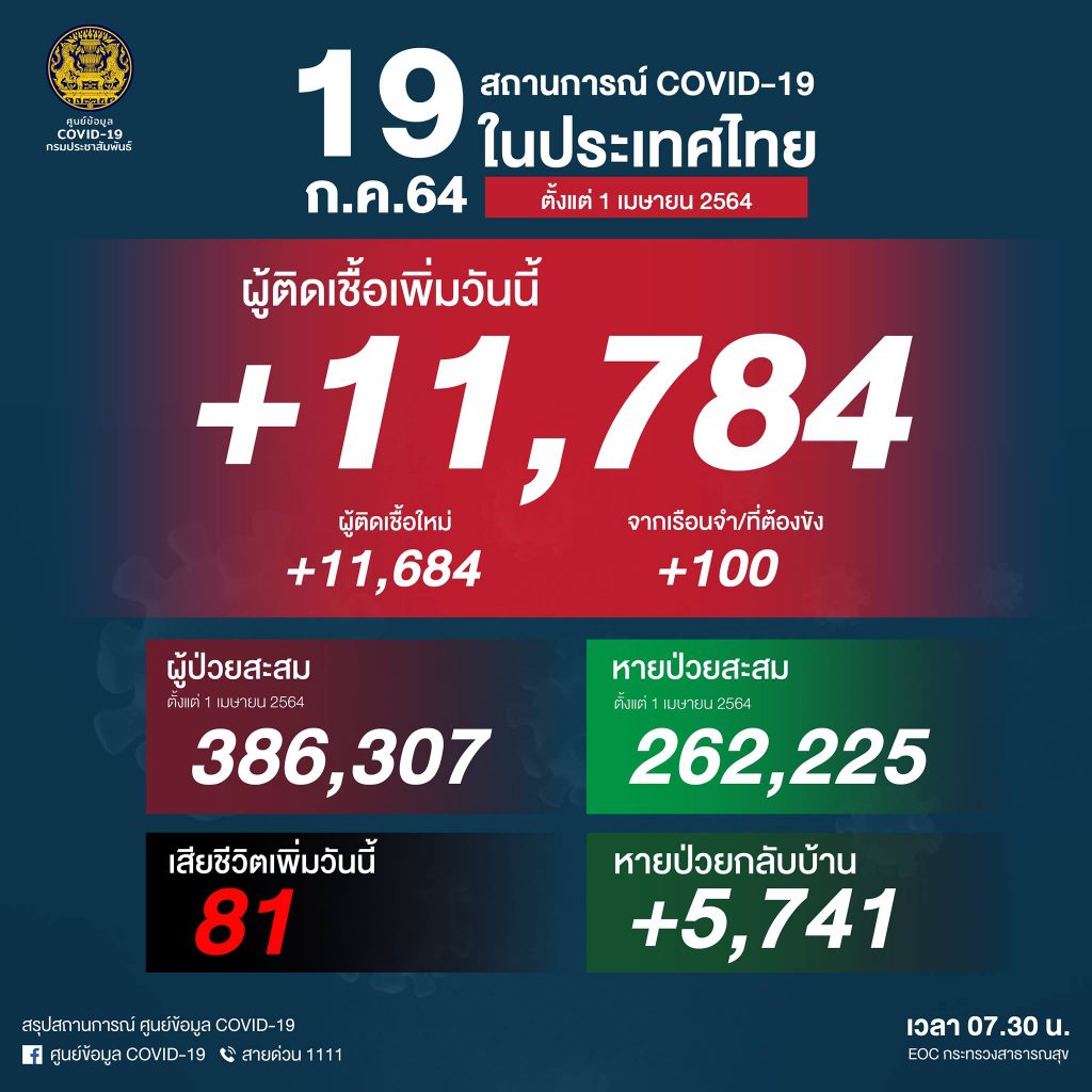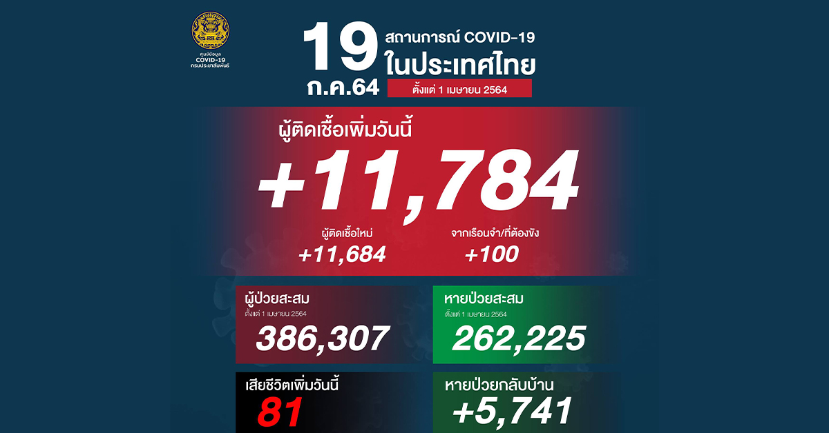 EOC กระทรวงสาธารณสุข รายงานสถานการณ์การติดเชื้อโควิด-19 รายใหม่ วันนี้ (19 ก.ค.) พบยอดผู้ติดเชื้อใหม่รวม 11,784 ราย จำแนกเป็นติดเชื้อใหม่ 11,684 ราย ติดเชื้อภายในเรือนจำ/ที่ต้องขัง 100 ราย ยืนยันสะสม 386,307 ราย (ตั้งแต่ 1 เมษายน) หายป่วยกลับบ้าน 5,741 ราย มีผู้เสียชีวิตเพิ่ม 81 ราย ทั้งนี้ เวลา 12.30 น. ศบค. จะแถลงรายละเอียดอย่างเป็นทางการอีกครั้ง .-สำนักข่าวไทย