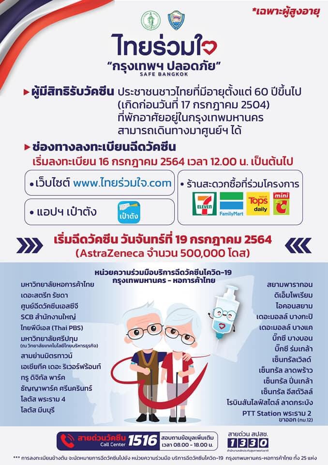 ส่วนจากกระแสข่าวก่อนหน้านี้ ที่ระบุว่า กทม. ได้รับการจัดสรรวัคซีนเมื่อสัปดาห์ที่ผ่านมา แต่กลับไม่เร่งนำมาฉีดให้ประชาชนที่ลงทะเบียนผ่านแอปพลิเคชันไทยร่วมใจ กทม.ชี้แจงว่าไม่เป็นความจริง กทม.ได้รับการจัดสรรวัคซีนครบจำนวน 500,000 โดส เมื่อวันที่ 15 ก.ค.64 โดยที่ประชุมคณะอนุกรรมการการบริหารจัดการวัคซีนป้องกันโรคติดเชื้อไวรัสโคโรนา 2019 (COVID-19) กรุงเทพมหานคร เมื่อ 14 ก.ค.64 มีมติให้เร่งรัดฉีดวัคซีนแก่ผู้สูงอายุ เนื่องจากเป็นกลุ่มเปราะบางที่เสี่ยงต่อการติดเชื้อได้ง่าย และอาจมีอาการที่รุนแรง รวมทั้งมีอัตราการเสียชีวิตสูง จึงจำเป็นต้องเร่งฉีดวัคซีนในกลุ่มผู้สูงอายุให้ครบทั้งหมดโดยเร็ว โดยกำหนดเปิดรับลงทะเบียนผ่าน www.ไทยร่วมใจ.com ตั้งแต่ 16 ก.ค.64 เป็นต้นมา และเริ่มฉีดวัคซีนวันที่ 19 ก.ค.64 ณ หน่วยความร่วมมือบริการฉีดวัคซีนโควิด 19 กรุงเทพมหานคร – หอการค้าไทย ทั้ง 25 จุด