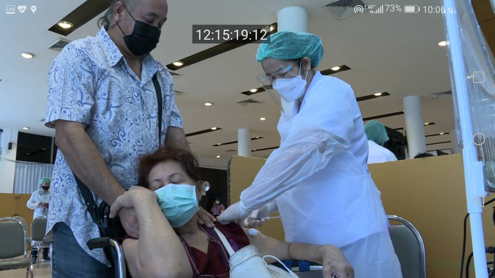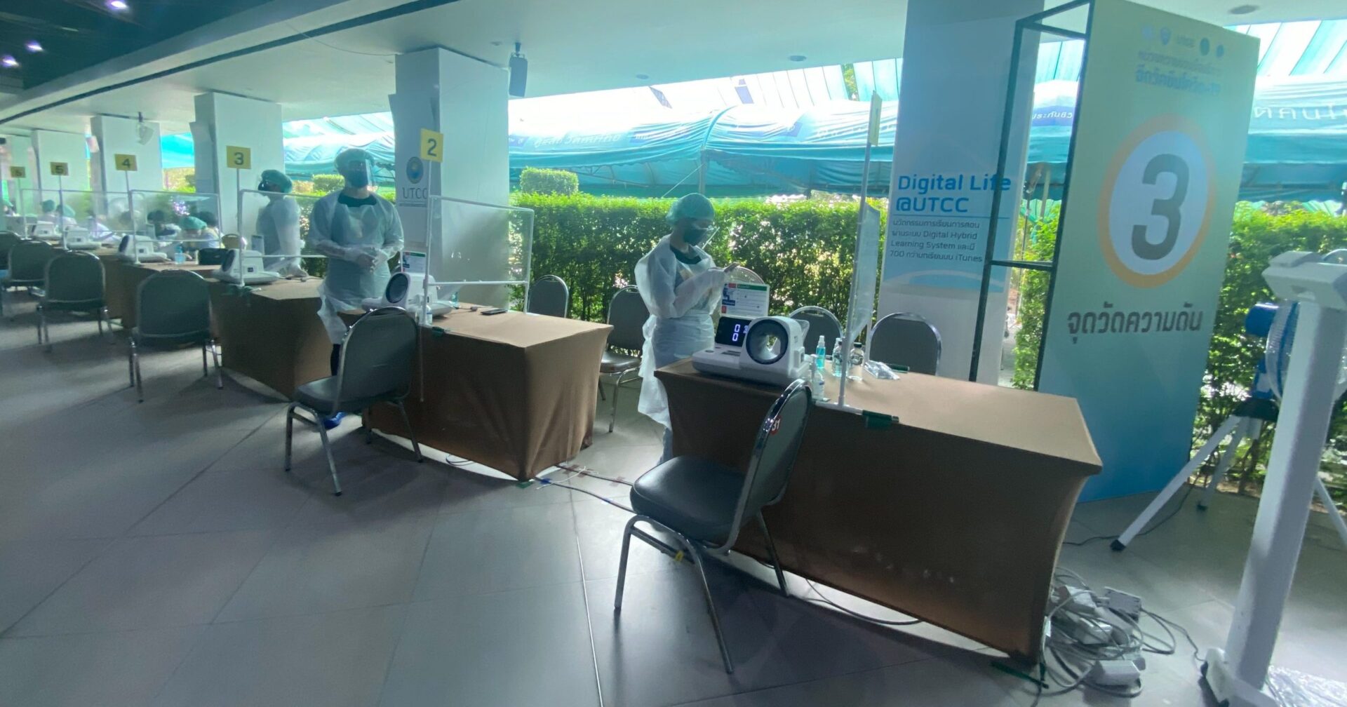 ในช่วงเช้ามีผู้สูงอายุเข้ามาฉีดวัคซีนแล้วประมาณ 50-60 คน บรรยากาศยังค่อนข้างบางตา และมีจำนวนผู้ที่ลงทะเบียนมาที่จุดนี้ วันแรก ประมาณ 300 คน ซึ่งส่วนใหญ่เป็นผู้ที่ลงทะเบียนทั้งทางเป๋าตัง ผ่านทางเว็บไซต์ไทยร่วมใจฯ ซึ่งวันนี้ศูนย์บริการฉีดวัคซีนที่มหาวิทยาลัยหอการค้าไทย มีวัคซีนรองรับไว้ 1,000 โดส พร้อมทีมบุคลากรแพทย์ที่มาให้บริการจากโรงพยาบาลกลาง และอาสาสมัครอาจารย์บุคลากรมหาวิทยาลัย มาร่วมช่วยให้บริการ โดยมีการจัดสถานที่รองรับไว้กว้างขวางทั้ง 7 จุดลงทะเบียน คัดกรอง จุดฉีดวัคซีน และจุดพักคอย พร้อมทั้งทีมแพทย์เผื่อกรณีฉุกเฉิน และมีทีมเภสัชกรคอยให้คำแนะนำหากผู้สูงอายุหรือกลุ่มเสี่ยวไม่มั่นใจว่า ยาที่ทานอยู่จะสามารถฉีดวัคซีนได้หรือไม่ ก็สามารถถือยานำมาปรึกษาก่อนฉีดได้