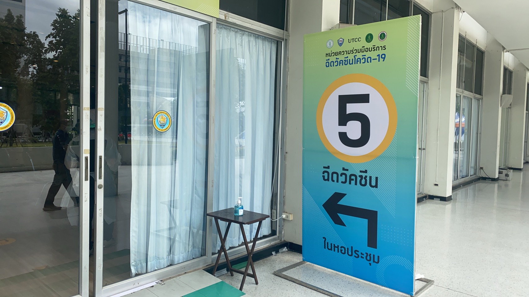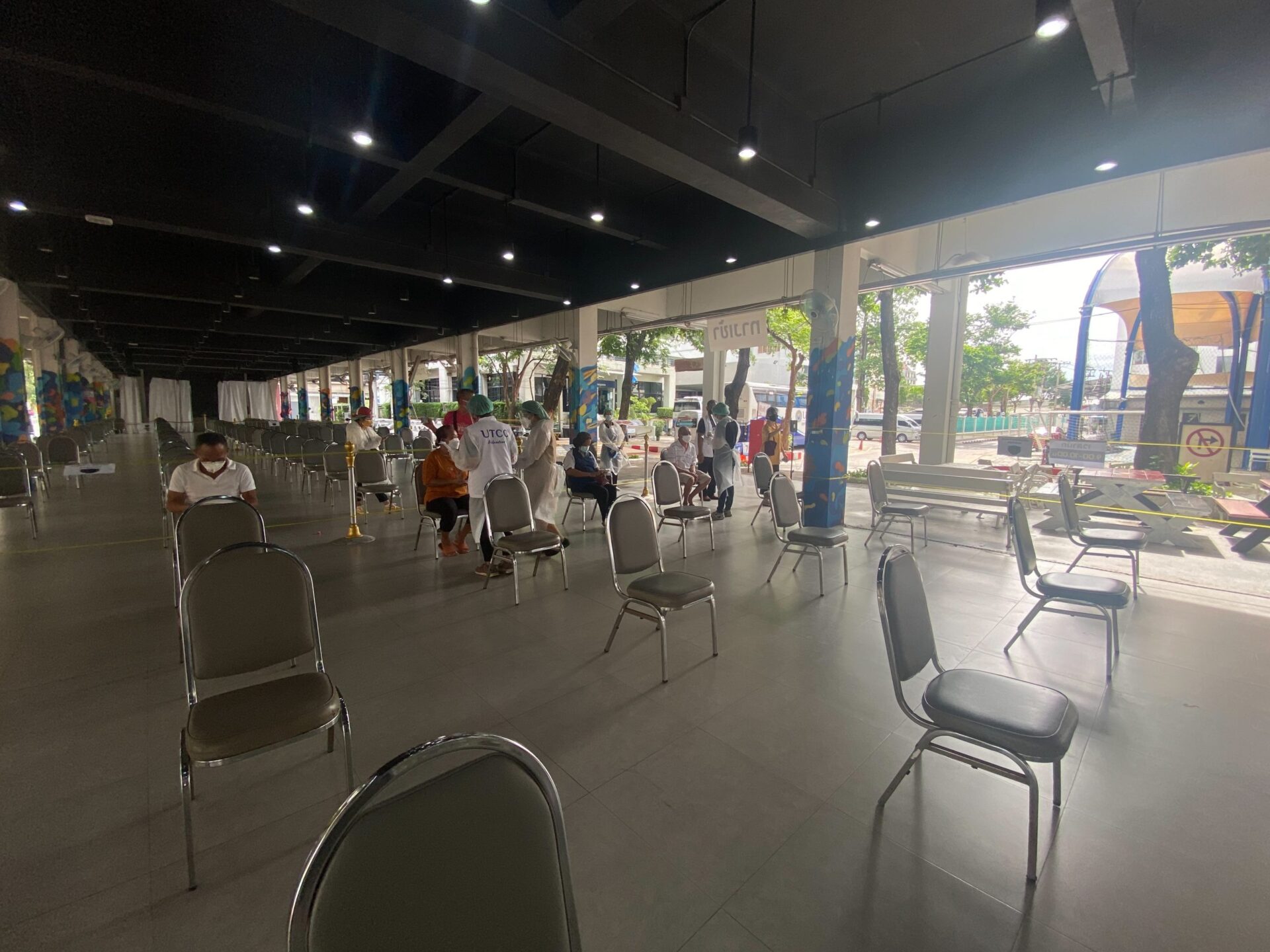 บรรยากาศที่หอประชุม มหาวิทยาลัยหอการค้าไทย 1 ใน 25 จุดบริการฉีดวัคซีนนอกโรงพยาบาล ของโครงการไทยร่วมใจกรุงเทพปลอดภัย วันแรกที่เปิด เริ่มฉีดวัคซีนให้กับผู้สูงอายุที่มีอายุ 60 ปีขึ้นไป (เกิดก่อน 17 ก.ค.2504) และกลุ่มเสี่ยง7โรค