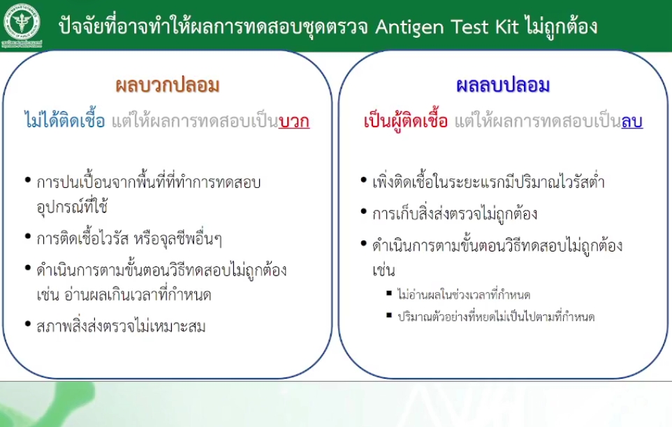 ขณะนี้ห่วงเรื่องผลการตรวจไม่ได้มาตรฐาน กลายเป็นบวกลวง เพราะการตรวจไม่ได้มาตรฐาน ทั้งการเก็บตัวอย่างที่ปนเปื้อน หรือการติดเชื้ออื่น แต่ที่น่าห่วงกว่าคือ ผลลบลวง ที่น่ากลัวมากเป็นผู้ติดเชื้อ แต่ Test Kit ให้ผลลบ เพราะเชื้อน้อยจากตรวจไม่ได้มาตรฐาน กลัวเจ็บแยงจมูกไม่ลึกพอ ฉะนั้นเมื่อได้ผลลบ อย่าคิดว่าตัวเองไม่ป่วย และชะล่าใจ ต้องกักตัวอยู่และรอตรวจซ้ำอีกครั้ง