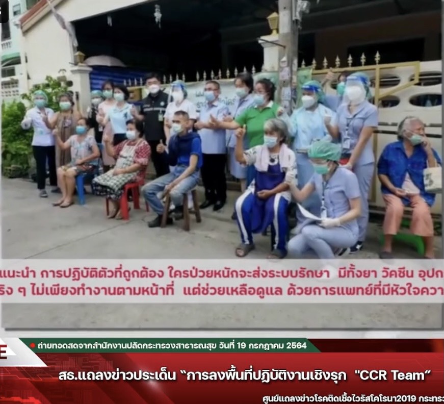 สธ. 19 ก.ค.-“CCR Team” 188 ทีม ปฏิบัติงานเชิงรุก เร่งช่วยเหลือผู้ติดเชื้อโควิด-19 ในชุมชนเขตเมือง ทั้งใน กทม. และปริมณฑล ที่ยังพบตกหล่นเข้าไม่ถึงการรักษาอีกจำนวนมาก โดยเฉพาะกลุ่มผู้สูงอายุที่ยังไม่ได้รับการฉีดวัคซีนเกือบ 100%