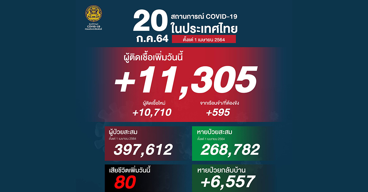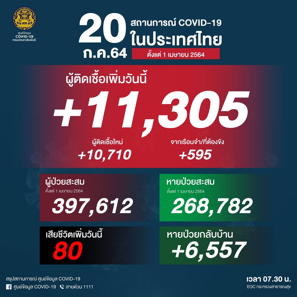 EOC กระทรวงสาธารณสุข รายงานสถานการณ์การติดเชื้อโควิด-19 รายใหม่ วันนี้ (20 ก.ค.) พบยอดผู้ติดเชื้อใหม่รวม 11,305 ราย จำแนกเป็นติดเชื้อใหม่ 10,710 ราย ติดเชื้อภายในเรือนจำ/ที่ต้องขัง 595 ราย ยืนยันสะสม 397,612 ราย (ตั้งแต่ 1 เมษายน) หายป่วยกลับบ้าน 6,557 ราย มีผู้เสียชีวิตเพิ่ม 80 ราย .-สำนักข่าวไทย